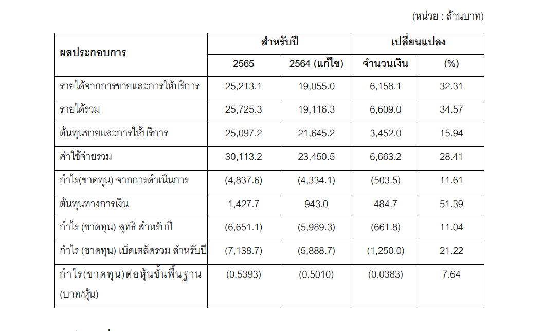 ขณะที่ในปี 2565 กลุ่มบริษัทฯ มีรายได้จากการขายและการให้บริการ 25,213 ล้านบาท เพิ่มขึ้น 6,158 ล้านบาท หรือเพิ่มขึ้น 32.31% จากปี 2564 และมีรายได้รวม 25,725 ล้านบาท เพิ่มขึ้น 6,609 ล้านบาท หรือคิดเป็น 34.57% เมื่อเทียบกับปี 2564 โดยกลุ่มบริษัทฯ ประสบการขาดทุนสุทธิสำหรับปี 2565 จำนวน 6,651 ล้านบาท เพิ่มขึ้น 662 ล้านบาท หรือขาดทุนเพิ่มขึ้น 11.04% เมื่อเทียบกับปี 2564 ซึ่งรวมค่าใช้จ่ายและผลขาดทุนด้านเครดิตที่คาดว่าจะเกิดขึ้น 3,473 ล้านบาท