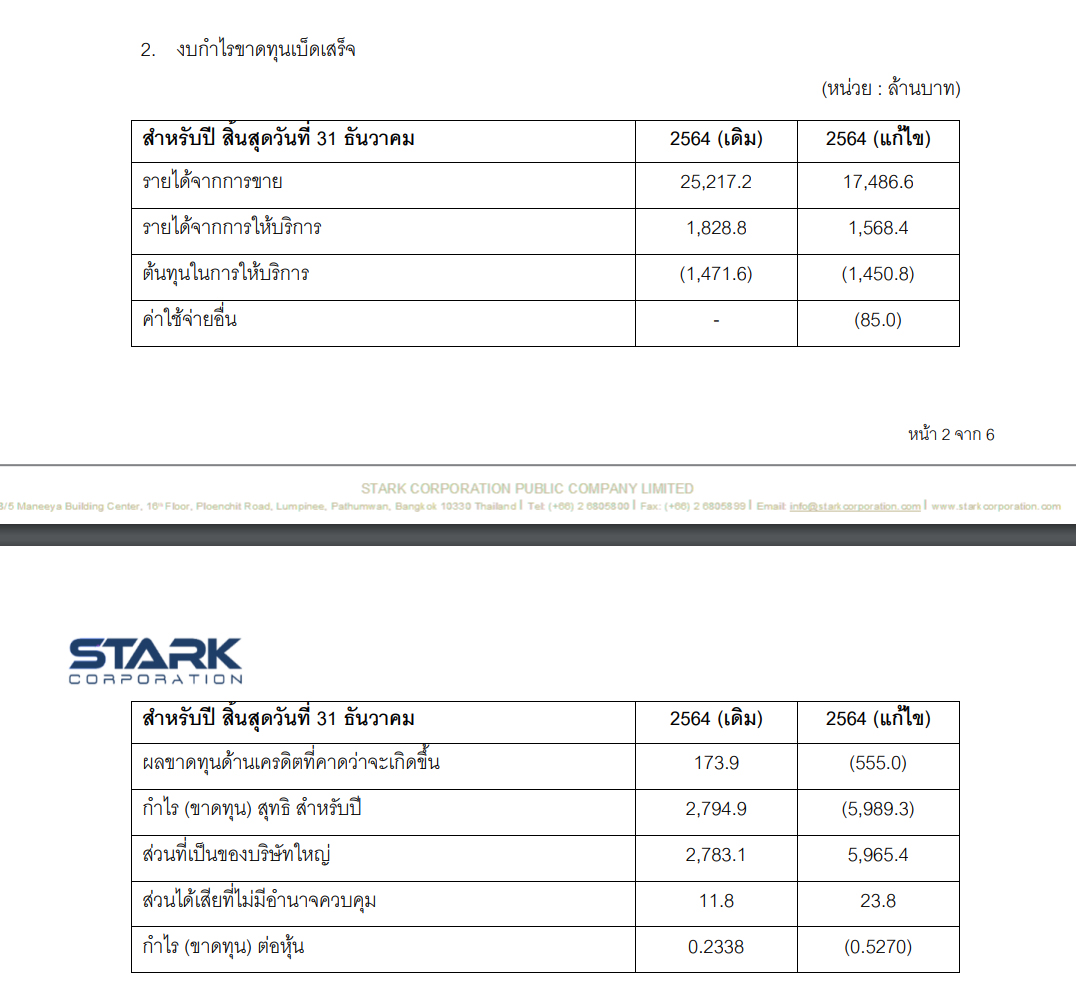 อนึ่ง ผลขาดทุนสุทธิประจำปี 2564 ของกลุ่มบริษัทฯ จะแตกต่างจาก หน้า 5 จาก 6 ผลกำไรสุทธิจากงบการเงินประจำปี 2564 ฉบับลงวันที่ 23 ก.พ.2565 เนื่องจากทางกลุ่มบริษัทต้องดำเนินการปรับปรุงรายการทางบัญชีเพื่อแก้ไขความผิดพลาดของการบันทึกบัญชีที่เกิดขึ้นในปี 2564 ที่ผ่านมา” STARK ระบุ