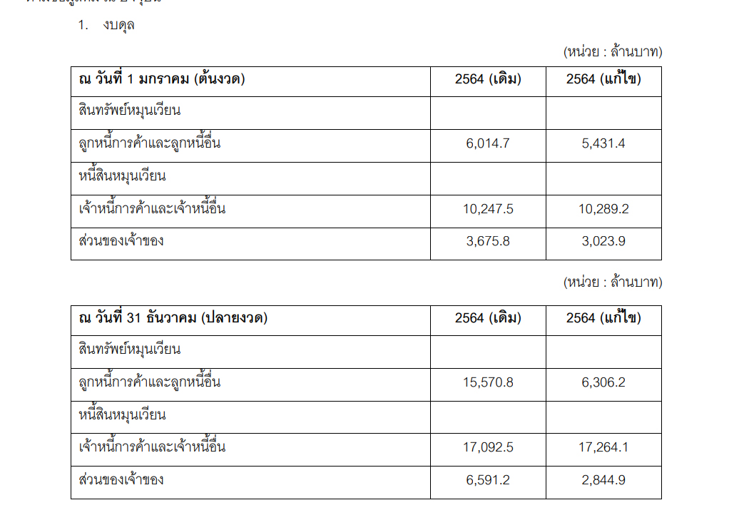 1.8 รายงานอายุลูกหนี้ (aging report) ณ วันที่ 31 ธ.ค.2565 และปี 2564 ถูกจัดทำอย่างไม่ถูกต้อง เนื่องจากข้อมูลวันที่ในใบแจ้งหนี้และ/หรือวันครบกำหนดชำระในรายงานอายุลูกหนี้ไม่สอดคล้องกับใบกำกับการขาย (sales invoice) ข้อผิดพลาดดังกล่าวมีผลต่อการคำนวนค่าเผื่อผลขาดทุนด้านเครดิตของลูกหนี้การค้า ซึ่งมีผลทำให้การบันทึกค่าเผื่อผลขาดทุนด้านเครดิตจากลูกหนี้การค้าต่ำไปหรือกำไรสุทธิสูงไป 65 ล้านบาท และ 729 ล้านบาท ในปี 2565 และ ปี 2564 ตามลำดับ ผู้บริหารได้ยอมรับและได้ทำการปรับปรุงรายการบัญชีทั้งในงบการเงินรวมปีปัจจุบันและปรับย้อนหลังในงบการเงินรวมปีก่อนให้ถูกต้องแล้ว