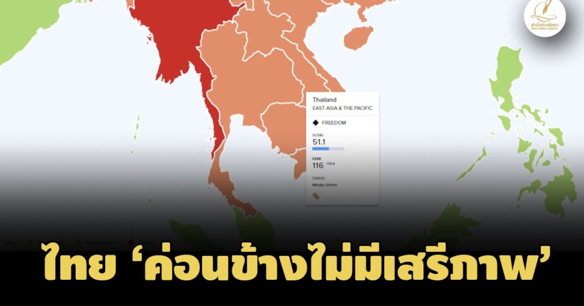 สถาบันคลังสมองสหรัฐฯ จัดไทยมีเสรีภาพอันดับที่ 116 จาก 164 ประเทศทั่วโลก อยู่ในกลุ่มค่อนข้างไม่มีเสรีภาพ ชี้คะแนนต่ำสุดด้านความชัดเจนของกฎหมาย สูงสุดด้านเสรีภาพทางเศรษฐกิจของผู้หญิง