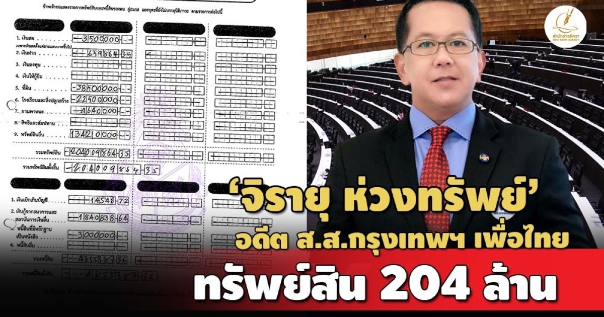 ป.ป.ช.เปิดบัญชีทรัพย์สิน 'จิรายุ ห่วงทรัพย์' กรณีพ้นตำแหน่ง ส.ส.กรุงเทพฯ พรรคเพื่อไทย ทรัพย์สินกว่า 204 ล. ทีมีดินในเขตธนบุรี-ลาดพร้าว-คลองสามวา กทม. สะสมอัญมณี-ทองคำ-พระเครื่อง-วัตถุโบราณ