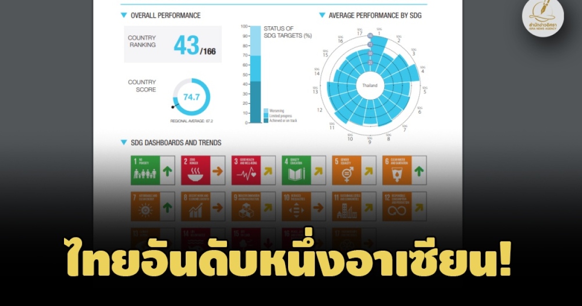 UN จัดไทยติดอันดับ 43 ดัชนีการพัฒนาอย่างยั่งยืน คิดเป็นอันดับ 1 ในอาเซียน พบด้านการขจัดความยากจน มีการเดินหน้าพัฒนาเป็นไปตามผลสัมฤทธิ์ แต่ยังถดถอยเรื่องการฟื้นฟูระบบนิเวศบนบก