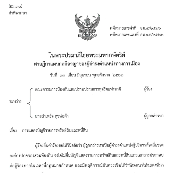 - ใช้‘ลูกน้อง’เป็น‘นอมินี’! คำพิพากษาฉบับเต็มคดีรองนายกเทศฯ ต.ต้นธง ลำพูน ยื่นบัญชีฯเท็จ