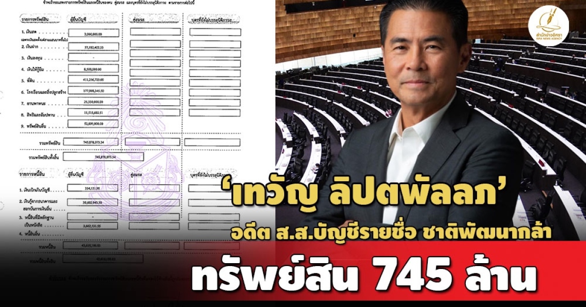 ป.ป.ช.เปิดบัญชีทรัพย์สิน 'เทวัญ ลิปตพัลลภ' อดีต ส.ส.บัญชีรายชื่อ พรรคชาติพัฒนากล้า ทรัพย์สินกว่า 745 ล. ทีมีดิน 41 แปลง มูลค่า 411 ล้าน สะสมพระเครื่อง-นาฬิกาข้อมือ รายได้ 212 ล./ปี
