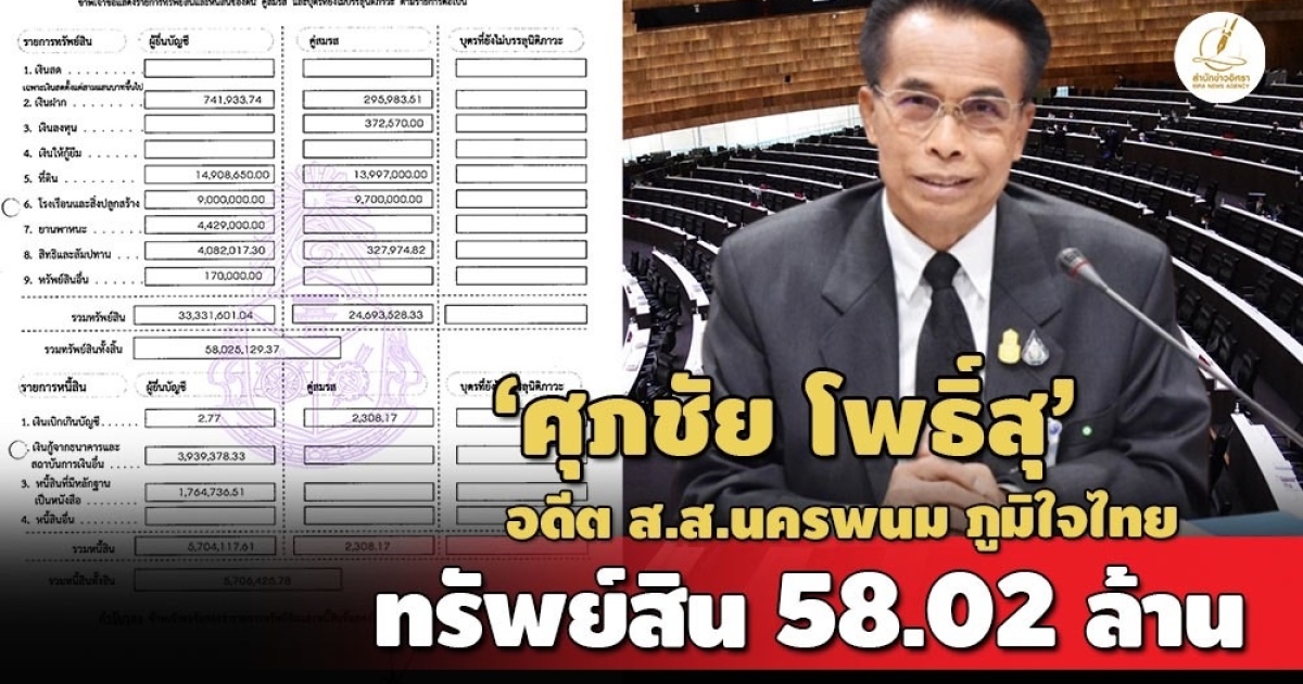 โดยนายศุภชัย พร้อมด้วยนางพูนสุข โพธิ์สุ คู่สมรส แจ้งมีทรัพย์สินทั้งสิ้น 58,025,129 บาท และหนี้สินทั้งสิ้น 5,706,425 บาท