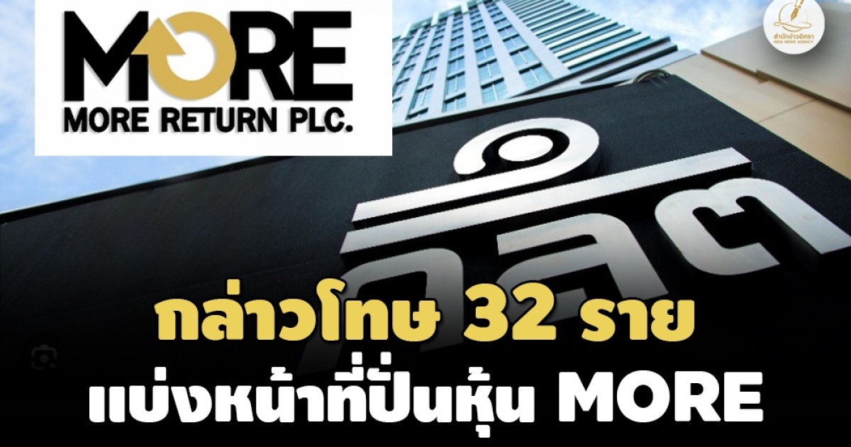 (21) นางสาวสิริรัตน์ สมณาศรี (22) นายธีรพงศ์ ด่านวณิชวงศ์ (23) นายวิศรุต เจียมจิตพลชัย (24) นายปรณัฐ นุชาชาติพงศ์ (25) นายภูดิท สุจริตกุล (26) นายวัชรินทร์ ยังให้ผล (27) นายธนยุทธ ฤกษ์รักษา (28) นายธรรมนูญ เวชวิทยาขลัง (29) นายภัทร ฉัตรเจริญสุข (30) นายชยพล พันธุ์แพ (31) นายพิเชษฐ์ ผลสุวรรณชัย และ (32) นางศศินภา วราพร ได้ร่วมกันกระทำการสร้างราคาหรือปริมาณการซื้อขายหลักทรัพย์ MORE ในช่วงระหว่างวันที่ 18 ก.ค.2565-10 พ.ย. 2565