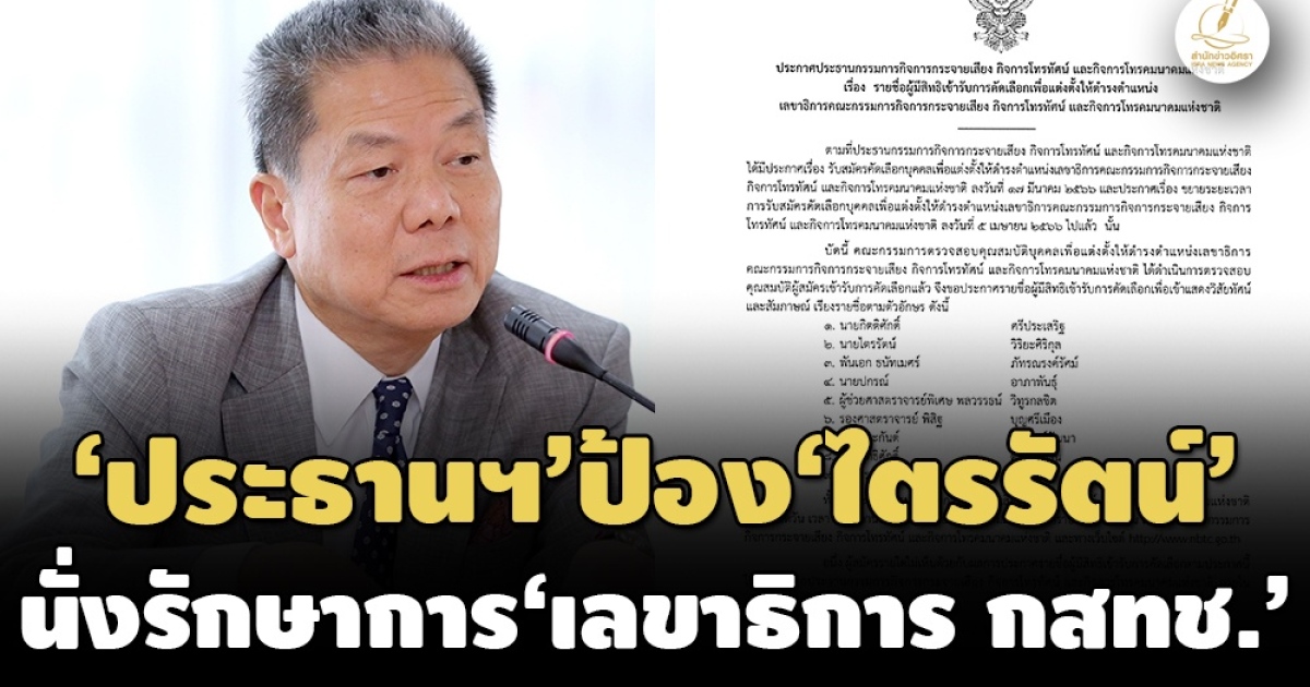 สำนักข่าวอิศรารายงานเพิ่มเติมว่า เมื่อวันที่ 27 มิ.ย.ที่ผ่านมา ศ.คลินิก นพ.สรณ บุญใบชัยพฤกษ์ ได้ลงนามประกาศประธานกรรมการกิจการกระจายเสียง กิจการโทรทัศน์ และกิจการโทรคมนาคมแห่งชาติ เรื่อง รายชื่อผู้มีสิทธิเข้ารับการคัดเลือกเพื่อแต่งตั้งให้ดำรงตำแหน่งเลขาธิการคณะกรรมการกิจการกระจายเสียง กิจการโทรทัศน์ และกิจการโทรคมนาคมแห่งชาติ และให้ผู้มีสิทธิเข้ารับการคัดเลือกฯ เข้าแสดงวิสัยทัศน์และสัมภาษณ์ตามวันเวลาที่กำหนด