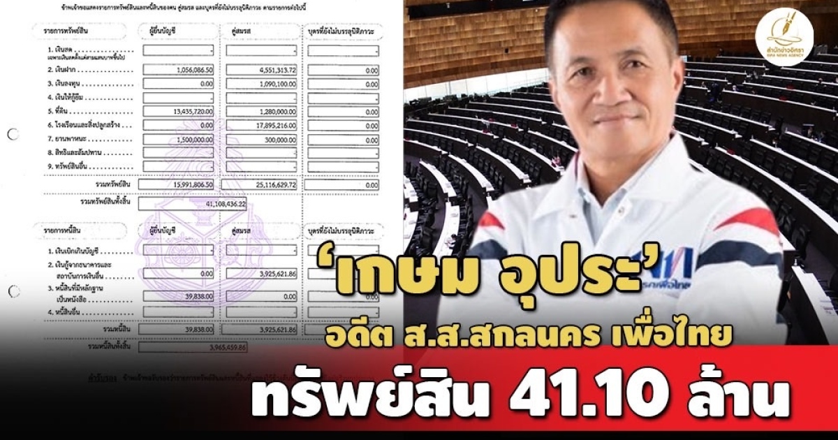 ป.ป.ช.เปิดบัญชีทรัพย์สิน 'เกษม อุประ' กรณีพ้นตำแหน่ง ส.ส.สกลนคร พรรคเพื่อไทย ทรัพย์สินกว่า 41 ล. ทีมีดินในสกลนคร 165 ไร่ รายได้ 2.3 ล./ปี
