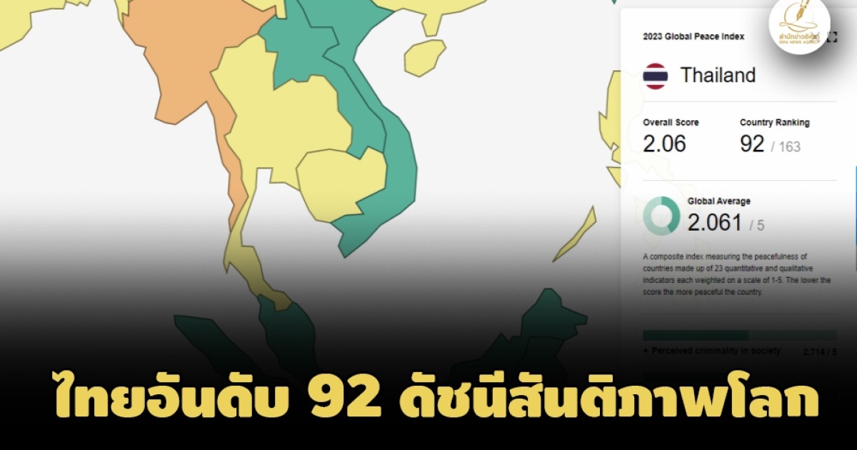 สถาบันเศรษฐศาสตร์ฯ ออสเตรเลีย จัดไทยอันดับ 92 ดัชนีสันติภาพโลก สูงกว่าสหรัฐฯ พบอันดับดีขึ้นกว่าปี 65 ถึง 13 อันดับแต่ยังคงมีปัญหาเรื่องจำนวนประชากรถูกจำคุก ขณะสิงคโปร์ครองอันดับหนึ่ง-เมียนมารั้งท้ายอาเซียน