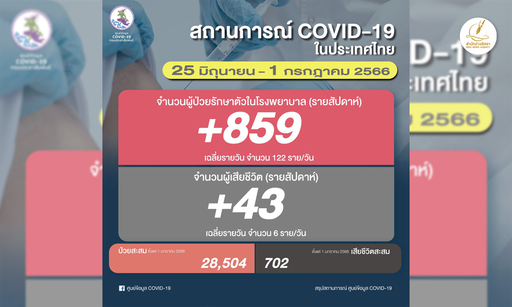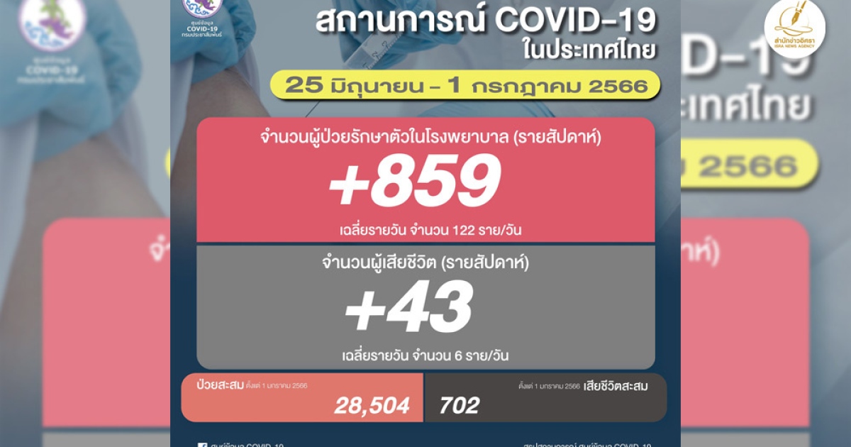 สำนักข่าวอิศรา (www.isranews.org) รายงานสถานการณ์แพร่ระบาดของโรคโควิด-19 ประเทศไทย ประจำสัปดาห์ ระหว่างวันที่ 25 มิ.ย. - 1 ก.ค. 2566 มีจำนวนผู้ติดเชื้อใหม่เข้ารักษาตัวโรงพยาบาล 859 ราย เฉลี่ยวันละ 122 ราย ทำให้จำนวนผู้ติดเชื้อสะสมอยู่ที่ 28,504 ราย (ตั้งแต่ 1 ม.ค. 2566)