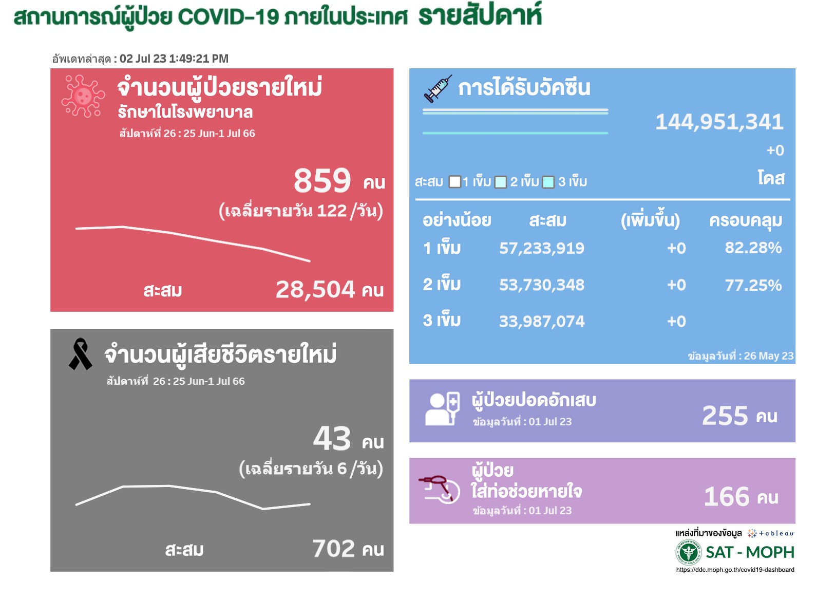 สถานการณ์โควิดไทย สัปดาห์ล่าสุด 25 มิ.ย. - 1 ก.ค. 2566 ติดเชื้อเข้ารักษาใน รพ.ใหม่ 859 ราย เฉลี่ย 122/วัน เสียชีวิต 43 ราย อาการหนัก 255 ราย