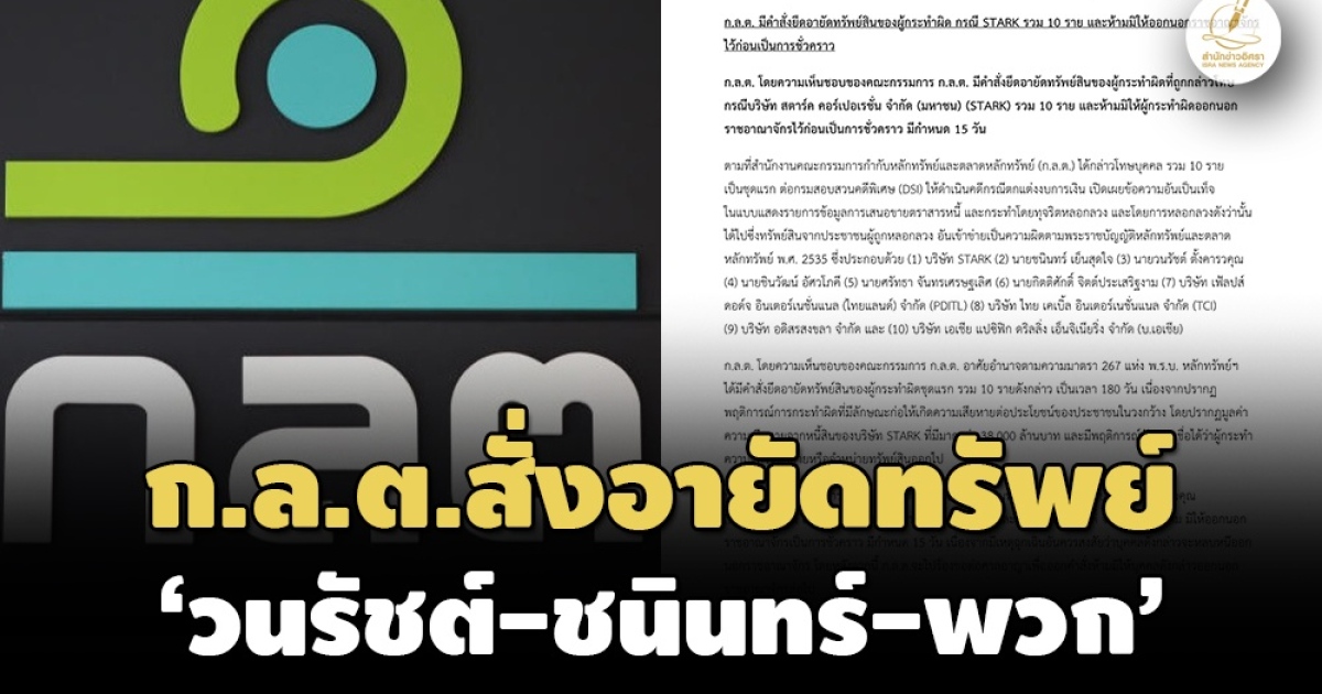 ก.ล.ต. สั่งยึดอายัดทรัพย์สิน 'ชนินทร์ เย็นสุดใจ-วนรัชต์ ตั้งคารวคุณ-พวก' กระทำความผิดกรณี STARK สั่งห้ามมิให้ออกนอกราชอาณาจักรไว้ก่อนเป็นการชั่วคราว ระบุกรณี STARK ปรากฏความเสียหาย 3.8 หมื่นล้าน
