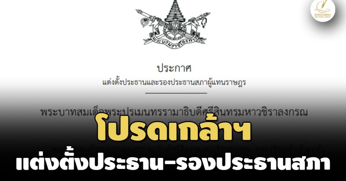 ราชกิจจานุเบกษา เผยแพร่ประกาศโปรดเกล้าฯ แต่งตั้งประธานและรองประธานสภาผู้แทนราษฎร