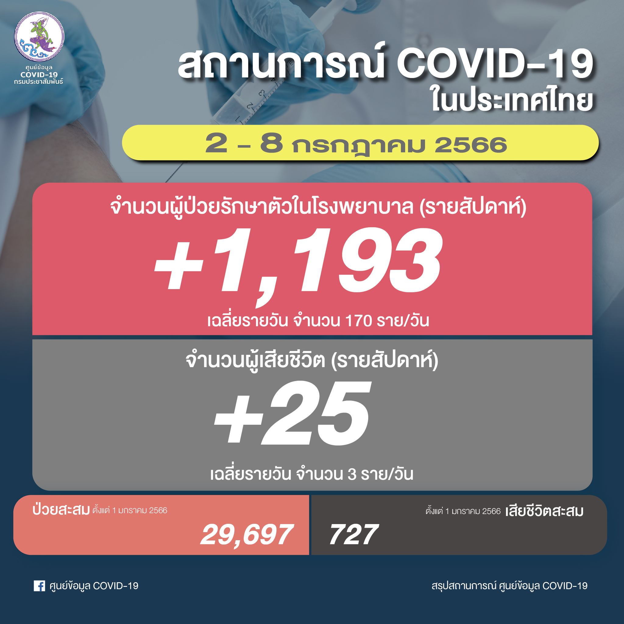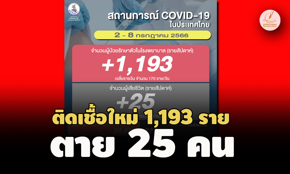 สถานการณ์โควิดไทย สัปดาห์ล่าสุด 2-8 ก.ค. 2566 ติดเชื้อใหม่เข้ารักษาตัวใน รพ. 1,193 ราย 170 คน/วัน ยอดสะสม 29,697 ราย -ตาย 25 ราย เฉลี่ย 3 คน/วัน