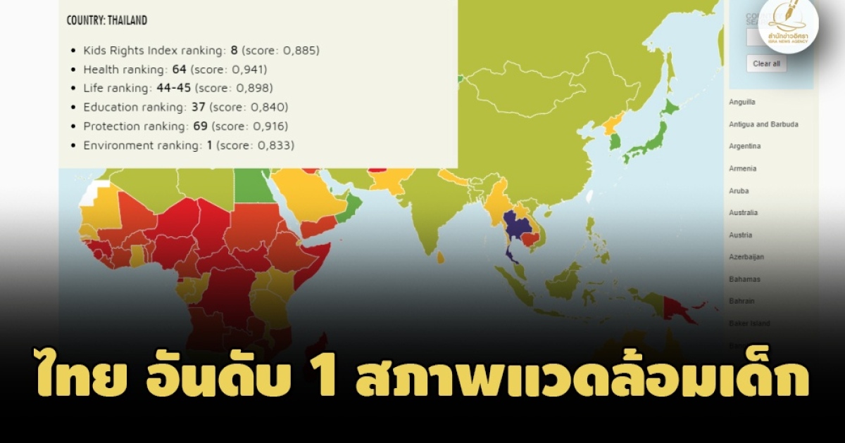 องค์กรสิทธิเด็กประกาศไทยติดอันดับ 8 ดัชนีสิทธิเด็กโลก ได้อันดับหนึ่งด้านสร้างสภาพแวดล้อมเพื่อเด็ก ขณะสวีเดนอันดับหนึ่ง ชาดรั้งท้าย