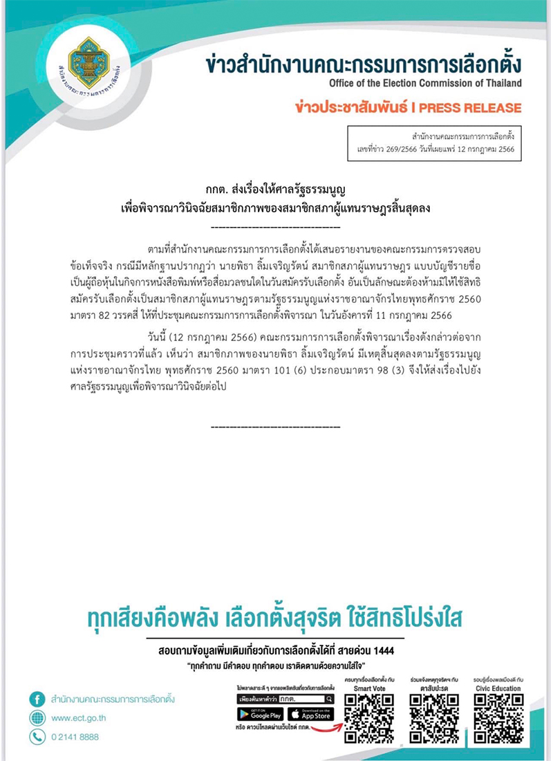 สำนักข่าวอิศรา (www.isranews.org) รายงานว่า วันที่ 12 กรกฎาคม 2566 มีรายงานข่าวระบุว่า ที่ประชุมคณะกรรมการการเลือกตั้ง (กกต.) มีมติให้ส่งเรื่องให้ศาลรัฐธรรมนูญวินิจฉัยว่าสมาชิกภาพ ส.ส.ของนายพิธา ลิ้มเจริญรัตน์ ส.ส. บัญชีรายชื่อและแคนดิเดตนายกรัฐมนตรี พรรคก้าวไกลสิ้นสุดลงตามรัฐธรรมนูญมาตรา 98 ( 3 )ประกอบมาตรา 101 ( 6 ) หรือไม่ จากเหตุมีชื่อถือครองหุ้นสื่อ บมจ. ไอทีวี (ITV) จำนวน 42,000 หุ้น รวมทั้งมีคำขอให้ศาลรัฐธรรมนูญพิจารณาสั่งให้ยุติการปฏิบัติหน้าที่ ส.ส.ไว้จนกว่าศาลจะมีคำวินิจฉัย หลังใช้เวลากว่า 3 วัน รับฟังและพิจารณาผลการตรวจสอบข้อเท็จจริงจากคณะกรรมการตรวจสอบข้อเท็จจริงขอสำนักงานกกต.แล้วเห็นว่ามีข้อมูลพยานหลักฐานเพียงพอให้เชื่อว่ามีเหตุตามที่มีการยื่นคำร้องจริง โดยนายอิทธิพร บุญประคอง ประธาน กกต.ได้ลงนามในคำร้องและมอบหมายให้เจ้าหน้าที่สำนักงานฯ นำไปยื่นต่อศาลรัฐธรรมนูญทันที