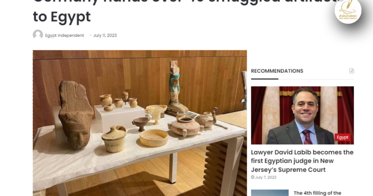 เยอรมนียึดโบราณวัตถุกว่า 40 ชิ้น ก่อนส่งคืนให้อียิปต์ ทูตอียิปต์แจงเป็นครั้งที่ 5 แล้ว ที่วัตถุโบราณถูกส่งคืนจากเยอรมนี เผยต้นทางลักลอบมาจากไทย หยุดพักที่เยอรมนี ก่อนจะไปถึงปลายทางที่สหราชอาณาจักร