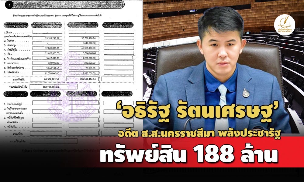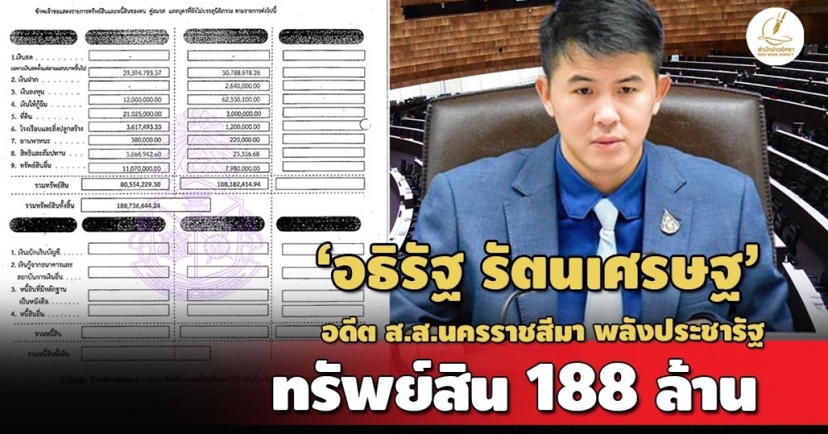 ป.ป.ช.เปิดบัญชีทรัพย์สิน 'อธิรัฐ รัตนเศรษฐ' กรณีพ้นตำแหน่ง ส.ส.นครราชสีมา พรรคพลังประชารัฐ ทรัพย์สินกว่า 188 ล. มีที่ดินในโคราช สะสมนาฬิกา-แหวนทองฝังอัญมณี-สร้อยคอทองคำ รายได้ 1.4 ล./ปี