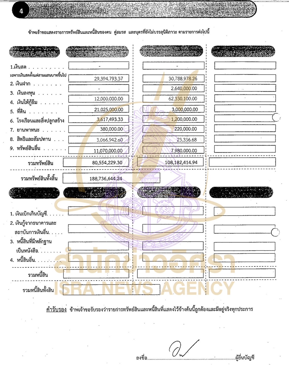 โดย นายอธิรัฐ พร้อมด้วย น.ส.อรัชมน รัตนวราหะ ผู้อยู่กินฉันสามีภริยา แจ้งมีทรัพย์สินทั้งสิ้น 188,736,644 บาท ไร้หนี้สิน