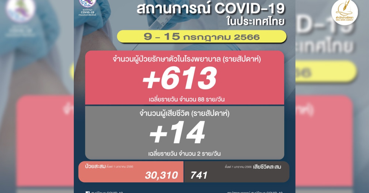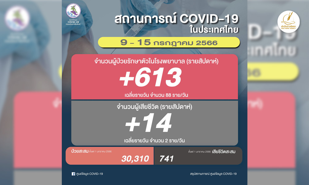 สำนักข่าวอิศรา (www.isranews.org) รายงานสถานการณ์แพร่ระบาดของโรคโควิด-19 ประเทศไทย ประจำสัปดาห์ ระหว่างวันที่ 9 - 15 ก.ค. 2566 มีจำนวนผู้ติดเชื้อใหม่เข้ารักษาตัวโรงพยาบาล 613 ราย เฉลี่ยวันละ 88 ราย ทำให้จำนวนผู้ติดเชื้อสะสมอยู่ที่ 30,310 ราย (ตั้งแต่ 1 ม.ค. 2566)