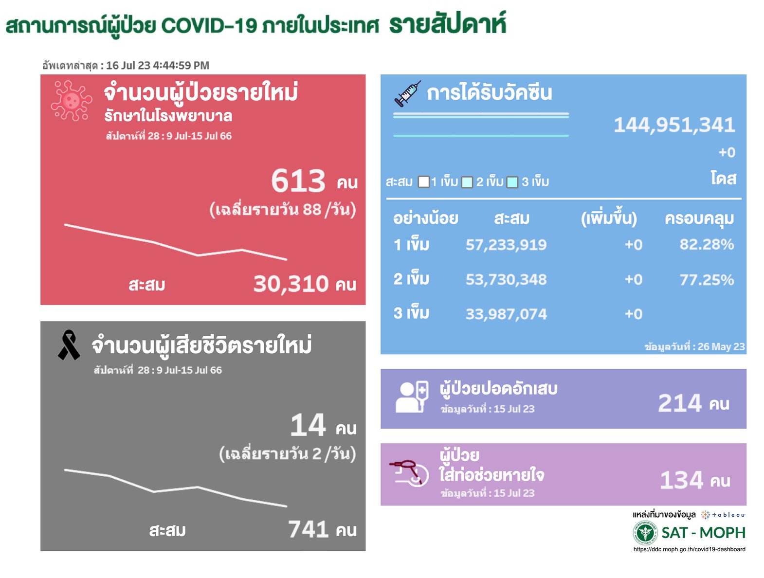 สถานการณ์โควิดไทย สัปดาห์ล่าสุด 9 - 15 ก.ค. 2566 ติดเชื้อเข้ารักษาใน รพ.ใหม่ 613 ราย เฉลี่ย 88/วัน เสียชีวิต 14 ราย อาการหนัก 214 ราย