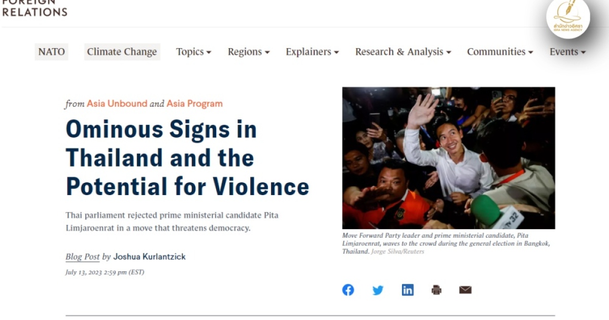 โดยคณะที่ปรึกษาด้านความสัมพันธ์ระหว่างประเทศ (Council on Foreign Relations ) ซึ่งเป็นสถาบันวิจัยและให้คำปรึกษาของสหรัฐฯ ได้วิเคราะห์บางส่วนว่าสาเหตุหนึ่งที่นายพิธาไม่ได้รับการเลือกจากสมาชิกวุฒิสภาโดยเฉพาะสายทหารเป็นเพราะความพยายามที่ต้องการจะแก้ไขกฎหมายหมิ่นพระบรมเดชานุภาพ ดังนั้นในวันที่ 19 ก.ค.ที่จะมีการลงคะแนนเลือกนายกรัฐมนตรีอีกครั้ง ก็มีแนวโน้มว่านายพิธาจะถูกปฏิเสธอีกครั้งหนึ่ง