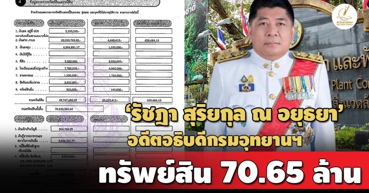 ป.ป.ช.เปิดบัญชีทรัพย์สิน 'รัชฎา สุริยกุล ณ อยุธยา' อดีตอธิบดีกรมอุทยานฯ ทรัพย์สิน 70 ล้าน มีเงินฝากกว่า 22 ล้าน มีพระเนื้อโลหะขอบทอง-อาวุธปืน ยืมเงินพี่ชาย 5 ล้าน