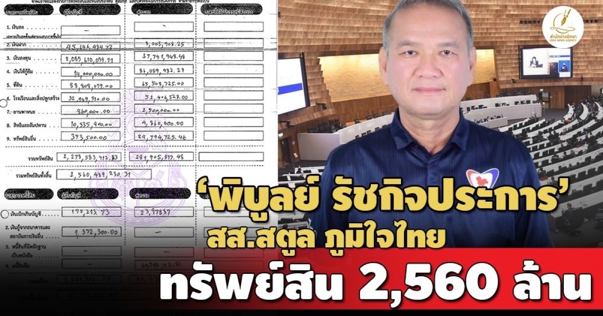 ป.ป.ช.เปิดบัญชีทรัพย์สิน 'พิบูลย์ รัชกิจประการ' กรณีพ้นตำแหน่ง สส.สตูล พรรคภูมิใจไทย ทรัพย์สินกว่า 2,560 ล้าน ถือหุ้นใน บ.รัชกิจ โฮลดิ้ง มีที่ดินใน สตูล - สงขลา อาวุธปืน 5 กระบอก รายได้ 40ล./ปี ภรรยามีทองคำแท่งหนักรวม 150 บาท