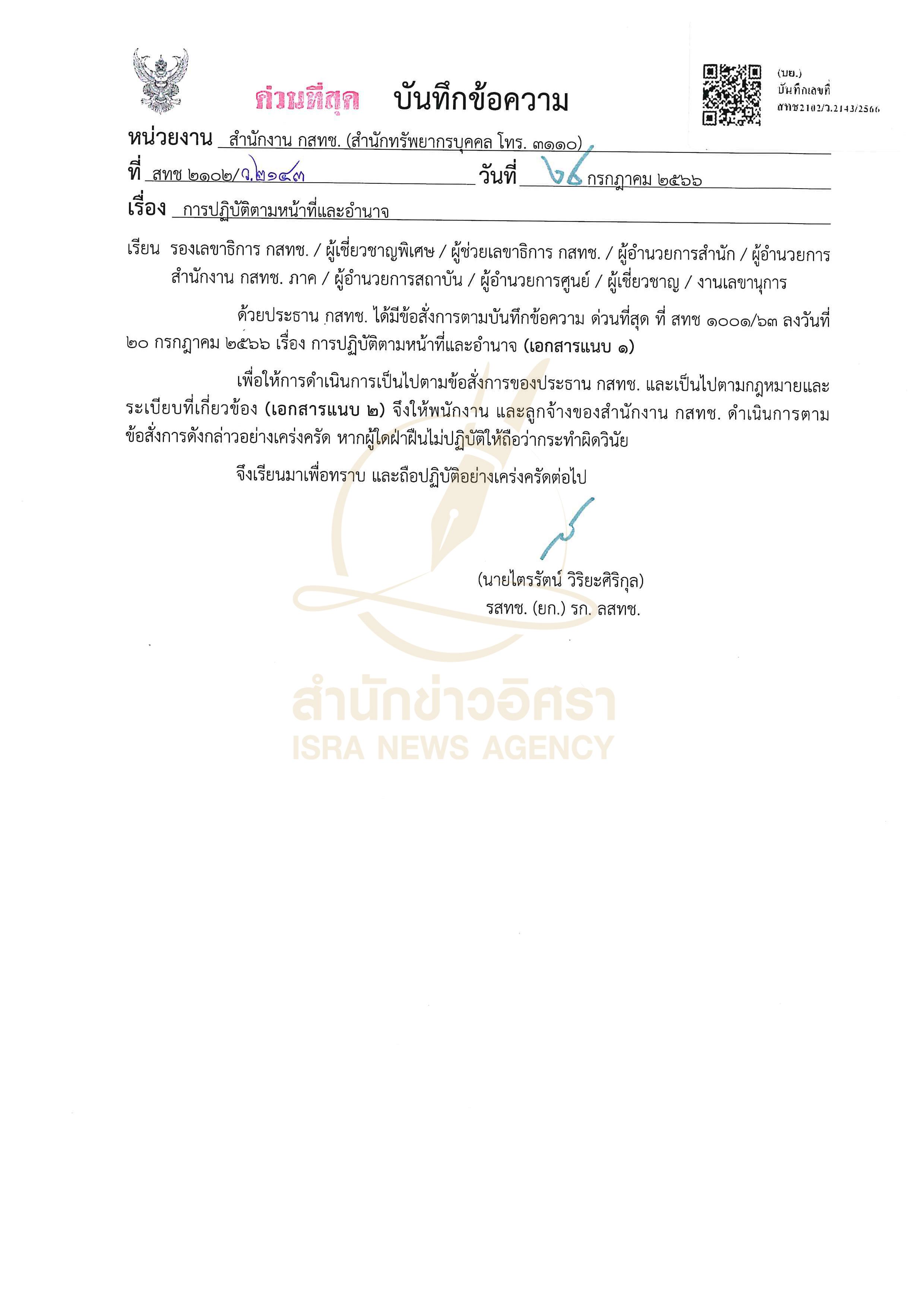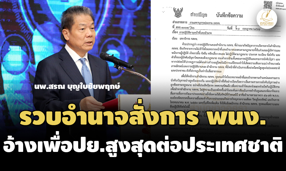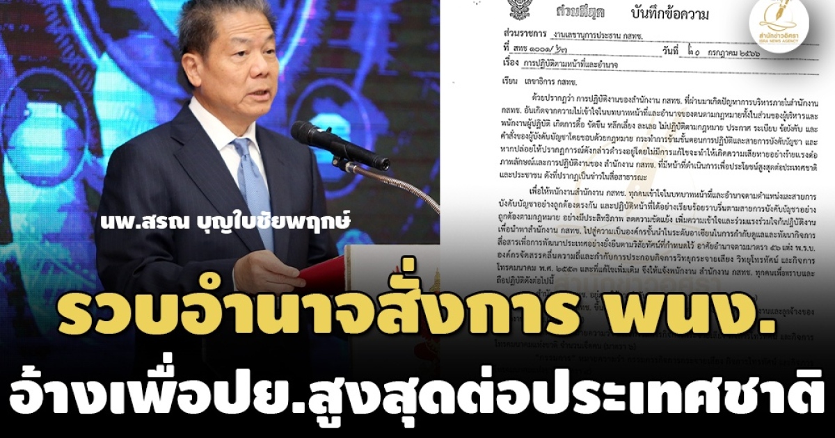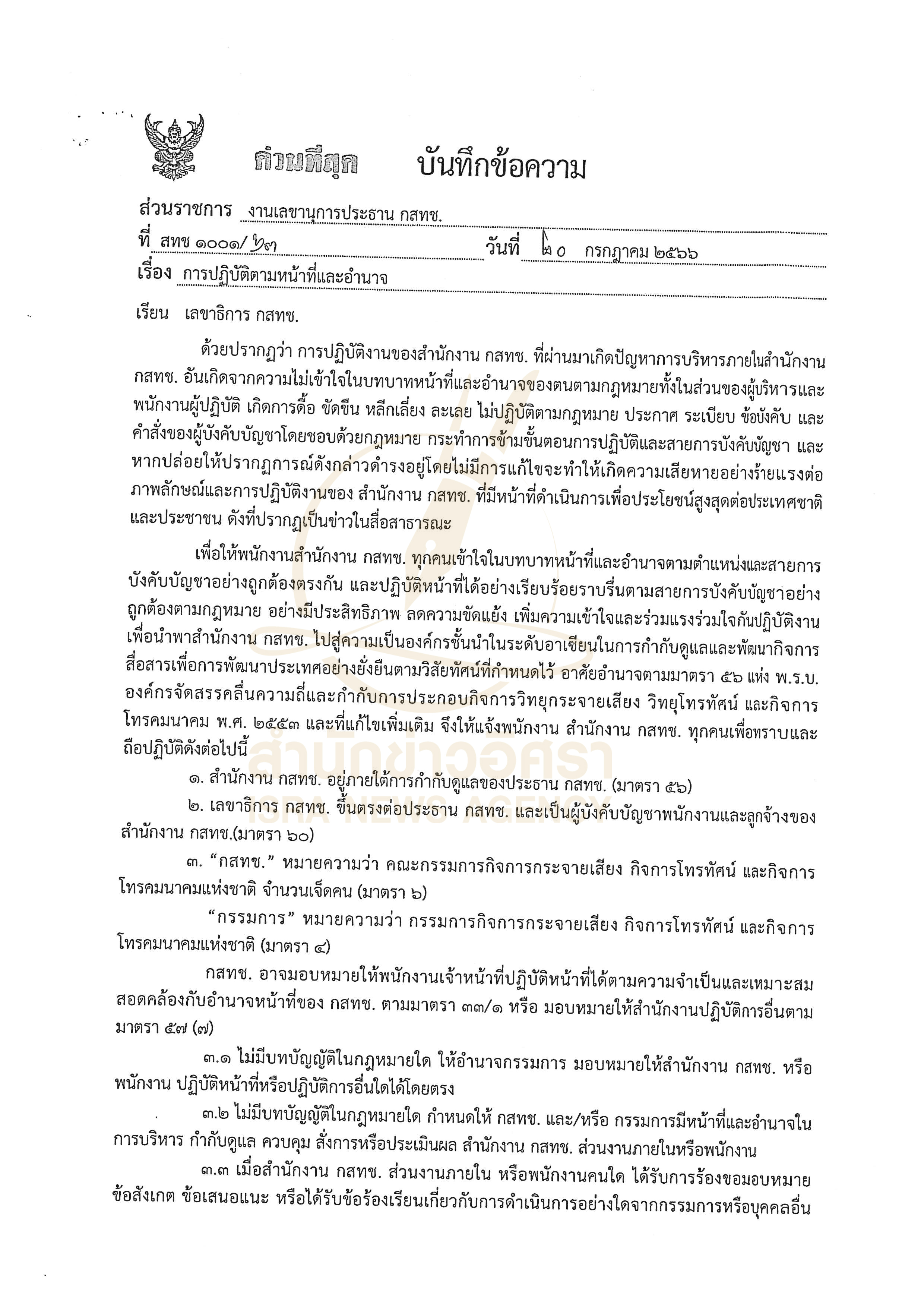 สำนักข่าวอิศรารายงานเพิ่มเติมว่า สำหรับหนังสือบันทึกข้อความ ด่วนที่สุด ที่ สทช. 2102/ว.2143 เรื่อง การปฏิบัติตามหน้าที่และอำนาจ ลงนามโดย ศ.คลินิก นพ.สรณ บุญใบชัยพฤกษ์ ประธาน กสทช. เมื่อวันที่ 20 ก.ค.2566 มีเนื้อหาว่า “ด้วยปรากฏว่า การปฏิบัติงานของสำนักงาน กสทช. ที่ผ่านมา เกิดปัญหาการบริหารภายในสำนักงาน กสทช. อันเกิดจากความไม่เข้าใจในบทบาทหน้าที่และอำนาจของตนตามกฎหมายทั้งในส่วนของผู้บริหารและพนักงานผู้ปฏิบัติ