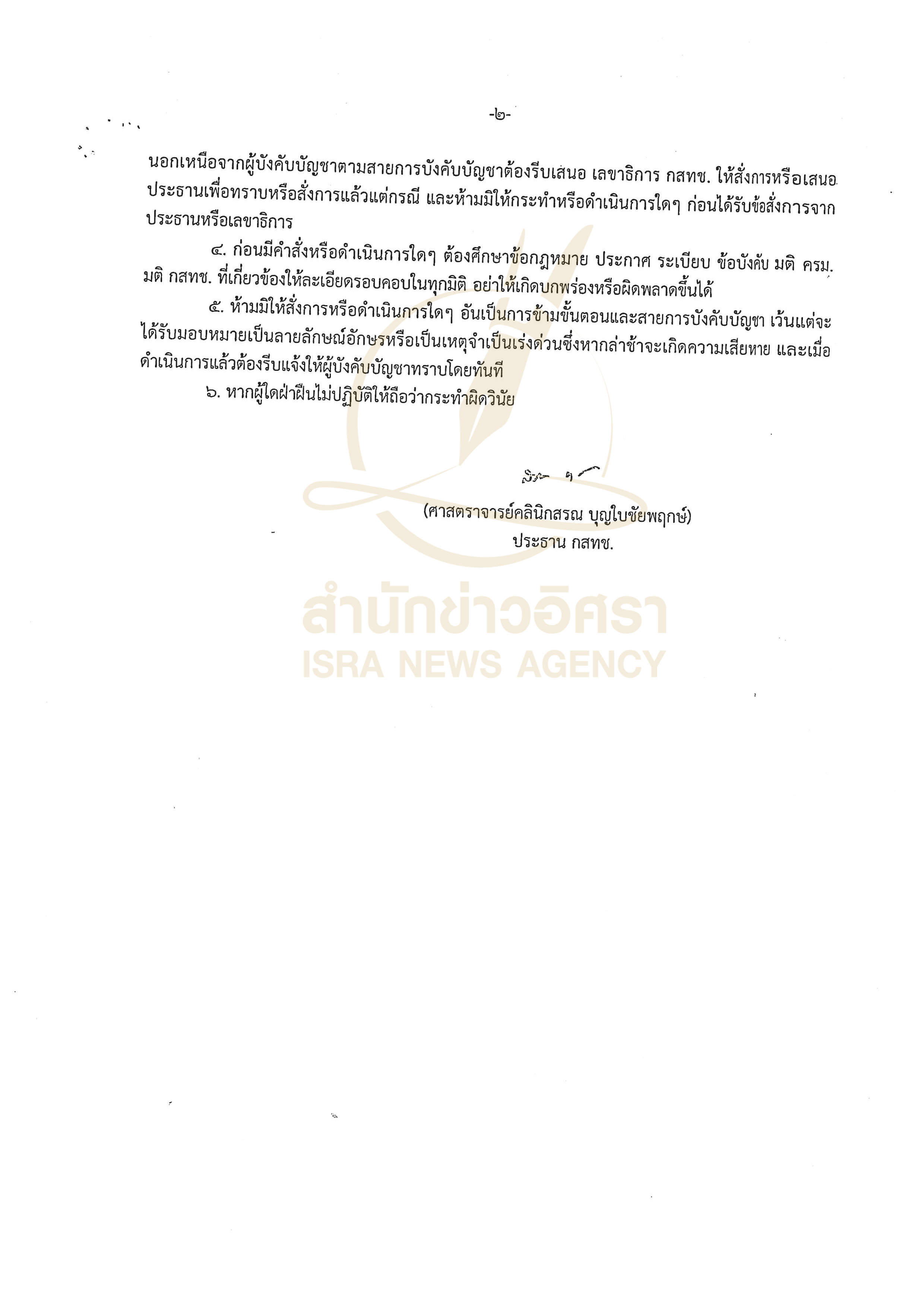 เพื่อให้การดำเนินการเป็นไปตามข้อสั่งการของประธาน กสทช. และเป็นไปตามกฎหมายและระเบียบที่เกี่ยวข้อง จึงให้พนักงาน และลูกจ้างของสำนักงาน กสทช. ดำเนินการตามข้อสั่งการดังกล่าวอย่างเคร่งครัด หากผู้ใดฝ่าฝืนไม่ปฏิบัติให้ถือว่ากระทำผิดวินัย จึงเรียนมาเพื่อทราบ และถือปฏิบัติอย่างเคร่งครัดต่อไป”