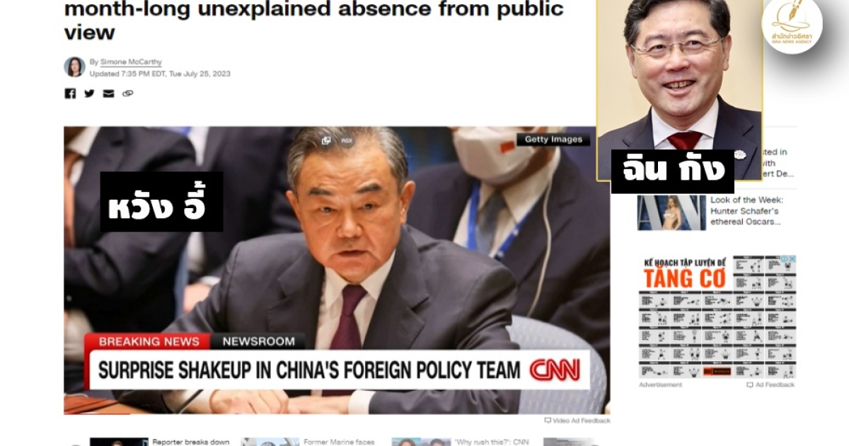 อนึ่งก่อนหน้านี้ มีข่าวว่านาย ฉิน กัง วัย 57 ปี อดีตที่ปรึกษาของสีจิ้นผิงและเอกอัครราชทูตจีนประจำสหรัฐฯเพิ่งขึ้นตำแหน่งรัฐมนตรีว่าการต่างประเทศจีนเมื่อเดือนธ.ค.ที่ผ่านมา ฉินได้หายตัวอย่างปริศนาไปจากสาธารณะนับจากวันที่ 25 มิ.ย. ระหว่างนี้ยังมีการมอบหมายให้ นาย หวัง อี้ ผู้อำนวยการสำนักคณะกรรมาธิการกิจการต่างประเทศ ไปร่วมการประชุมรัฐมนตรีต่างประเทศแห่งอาเซียนที่กรุงจาการ์ตา ประเทศอินโดนีเซียระหว่างวันที่ 11-14 ก.ค. ที่ผ่านมา (แทนที่จะเป็นฉิน กัง รัฐมนตรีว่าการกระทรวงต่างประเทศจีน) ท่ามกลางข่าวลือต่างๆนานา อาทิ ฉินกังป่วยหนัก และข่าวลือเรื่องอื้อฉาวชู้สาวกับนักข่าวพิธีกรรายการโทรทัศน์คนดังคือนางฟู่เสี่ยวเถียน