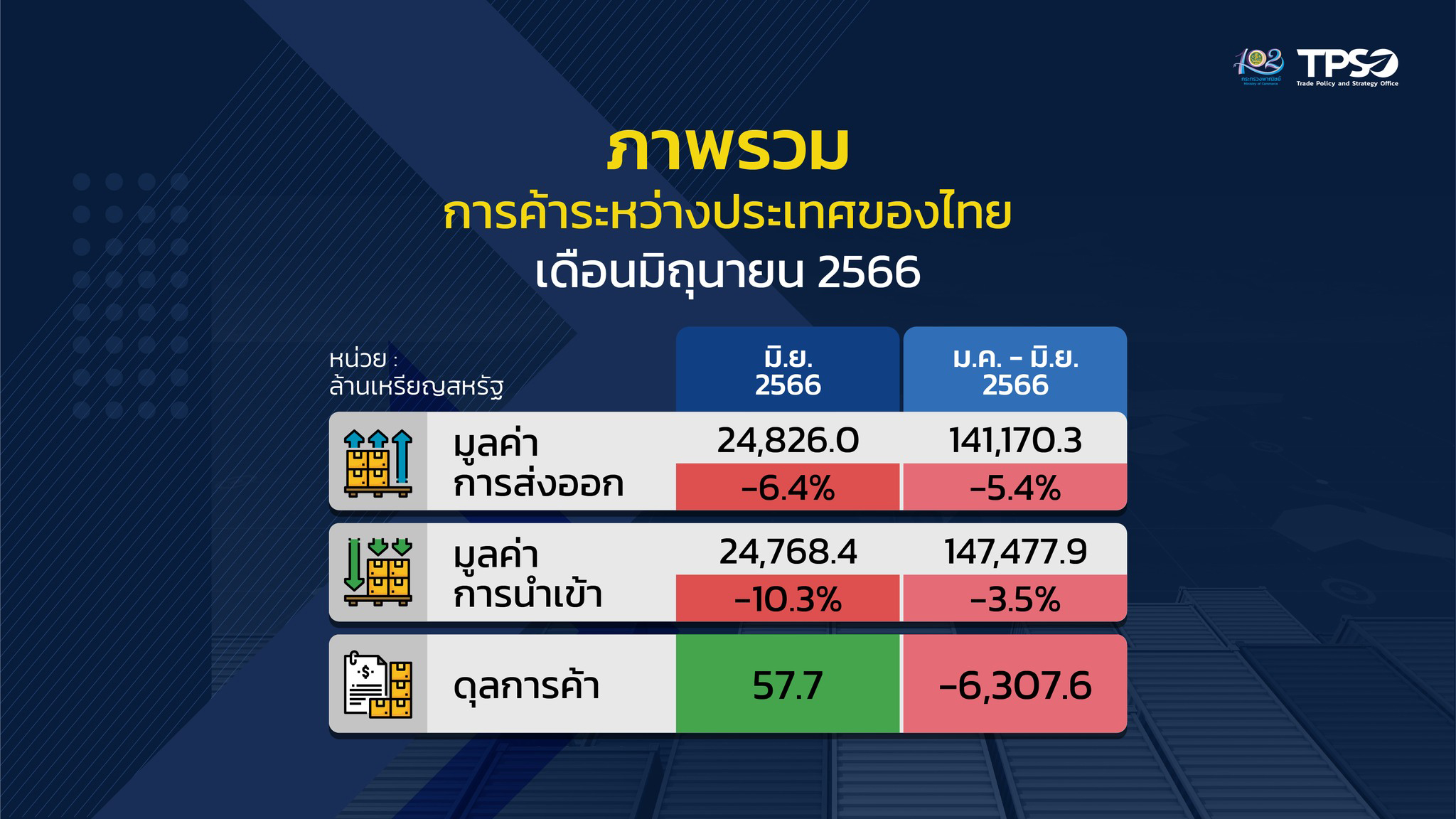 ส่วนภาพรวมการส่งออกไทยในช่วง 6 เดือนแรกของปี 2566 (ม.ค.-มิ.ย.2566) พบว่าการส่งออกไทย มีมูลค่า 141,170.3 ล้านดอลลาร์สหรัฐ หดตัว 5.4% เมื่อเทียบกับช่วงเดียวกันของปีก่อน และเมื่อหักสินค้าเกี่ยวเนื่องกับน้ำมัน ทองคำ และยุทธปัจจัย การส่งออกจะหดตัว 2.3% เมื่อเทียบกับช่วงเดียวกันของปีก่อน ส่วนการนำเข้า มีมูลค่า 147,477.9 ล้านดอลลาร์สหรัฐ หดตัว 3.5% ขณะที่ในช่วง 6 เดือนแรกของปีนี้ ไทยขาดดุลการค้า 6,307.6 ล้านดอลลาร์สหรัฐ