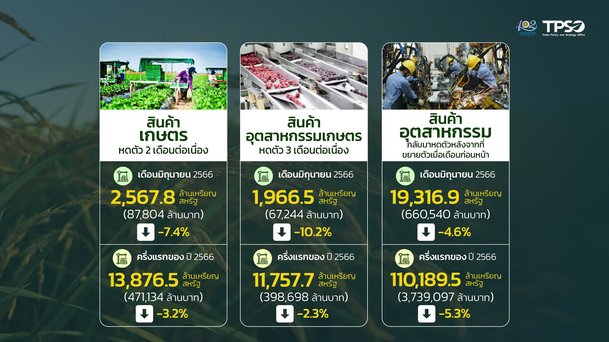 นายกีรติ กล่าวต่อว่า เมื่อพิจารณาการส่งออกสินค้าเดือน มิ.ย.2566 แยกเป็นกลุ่มสินค้า พบว่า การส่งออกสินค้าเกษตร มีมูลค่า 2,567.8 ล้านดอลลาร์สหรัฐ หดตัว 7.4% โดยหดตัว 2 เดือนต่อเนื่อง ,การส่งออกสินค้าอุตสาหกรรมเกษตร มีมูลค่า 1,966.5 ล้านดอลลาร์สหรัฐ หดตัว 10.2% โดยเป็นการหดตัว 3 เดือนต่อเนื่อง และการส่งออกสินค้าอุตสาหกรรม มีมูลค่า 19,316.9 ล้านดอลลาร์สหรัฐ หดตัว 4.6% โดยกลับมาหดตัวหลังจากขยายตัวในเดือนก่อน