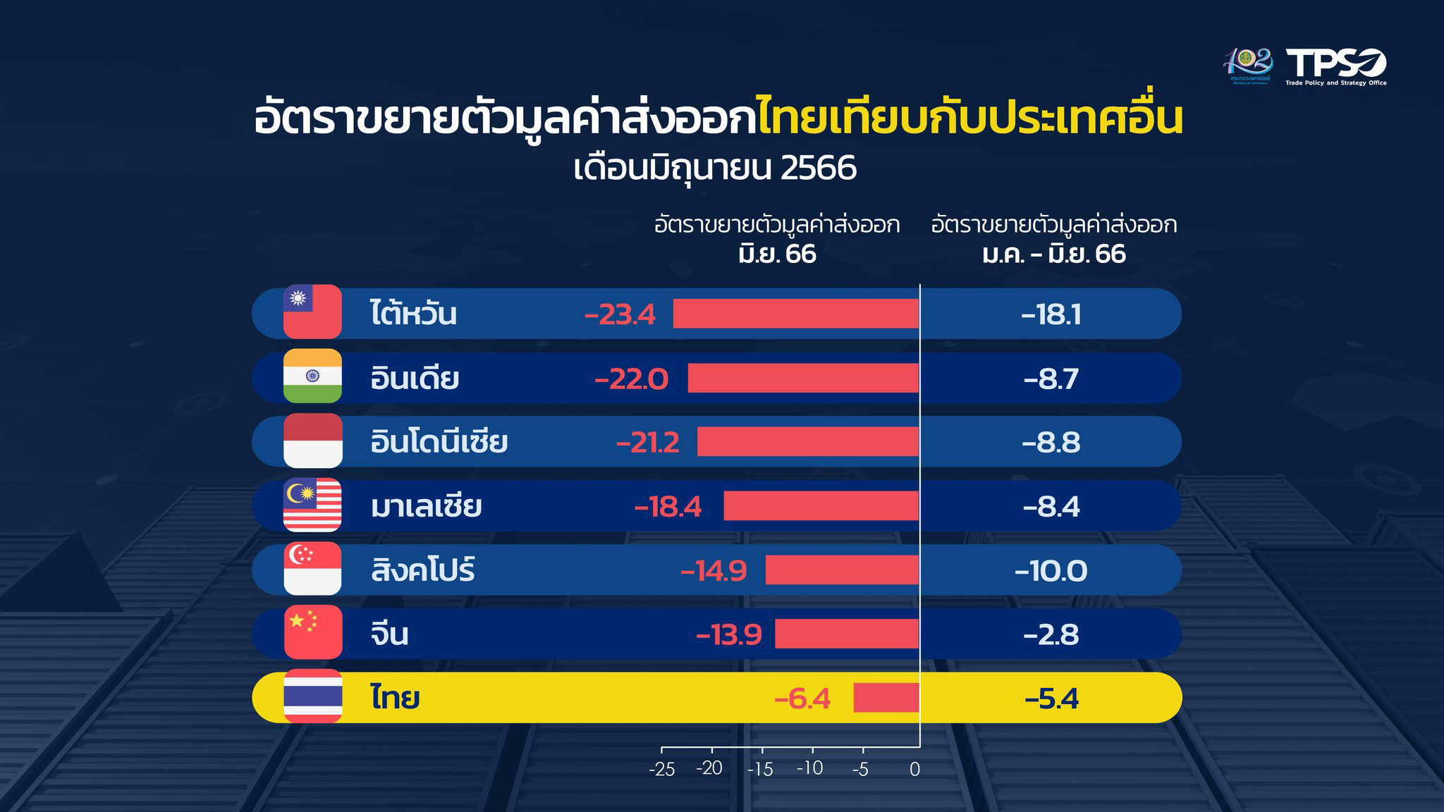“ถ้าเปรียบเทียบการส่งออกในเดือน มิ.ย.ของเราที่ติดลบ 6.4% กับประเทศส่งออกหลักๆที่เป็นคู่แข่งของเรา จะพบว่าเขาติดลบมากกว่าเรา ติดลบเป็นตัวเลข 2 หลัก เช่น ไต้หวันที่ติดลบ 23.4% อินเดียติดลบ 22% และอินโดนีเซียติดลบ 21.2% เป็นต้น ดังนั้น ของเราจึงไม่น่าตกใจอะไร ถึงแม้ว่าเราจะติดลบทุกเดือนก็ตาม” นายกีรติ กล่าว