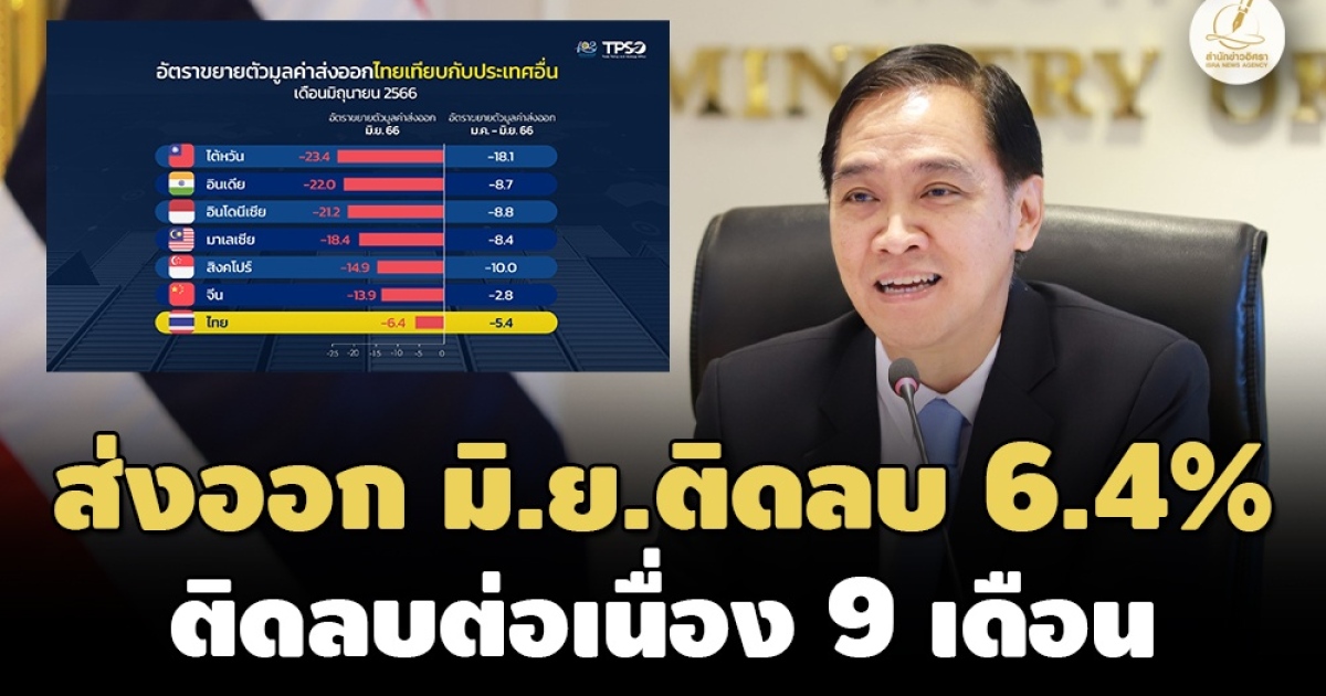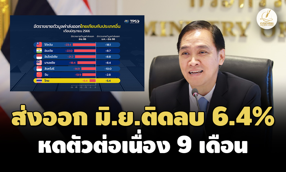 ‘พาณิชย์’ เผยส่งออกไทยเดือน มิ.ย.66 ติดลบ 6.4% หดตัวต่อเนื่องเป็นเดือนที่ 9 เหตุเศรษฐกิจโลกซบเซา-ตลาดจีนโตช้ากว่าที่คาด ขณะที่ครึ่งปีแรก ส่งออกติดลบ 5.4% ‘พาณิชย์’ ปลอบ ‘ไม่น่าตกใจอะไร’ ระบุประเทศคู่แข่งติดลบหนักกว่า