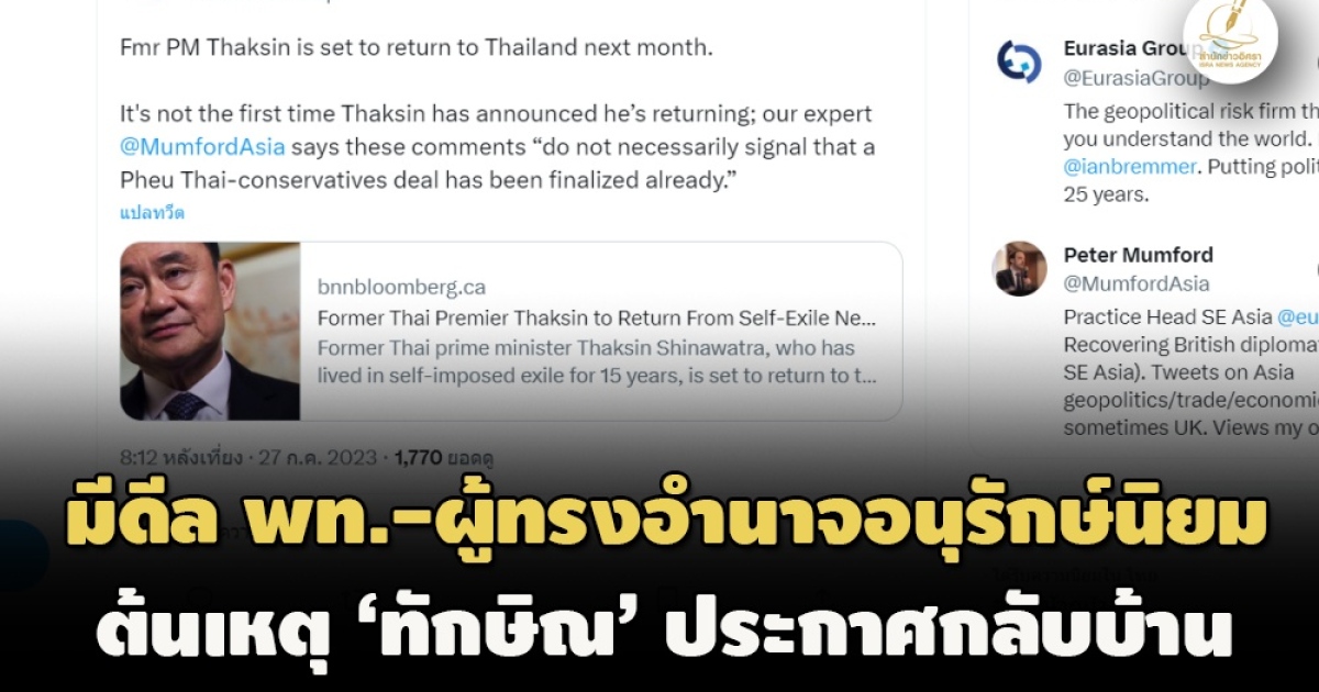 สำหรับกรณีที่นายทักษิณ ชินวัตร อดีตนายกรัฐมนตรีประกาศเดินทางกลับไทยในวันที่ 10 ส.ค.นั้น สำนักข่าวอิศรารายงานว่าทางด้านของนาย ปีเตอร์ มัมฟอร์ด หัวหน้าฝ่ายปฏิบัติการในภูมิภาคเอเชียตะวันออกเฉียงใต้ ณ ที่บริษัทที่ปรึกษาความเสี่ยงยูเรเซีย กรุ๊ป ได้ออกมากล่าววิเคราะห์ถึงกรณีนี้ว่าเป็นสัญญาณชัดเจนให้เห็นข้อตกลงที่มีระหว่างพรรคเพื่อไทยกับฝ่ายผู้ทรงอำนาจที่อยู่ขั้วอนุรักษ์นิยม แต่ก็ยังเป็นเรื่องที่น่าสงสัยอยู่ดีว่าอดีตนายกรัฐมนตรีจะเดินทางกลับมาจริงหรือไม่