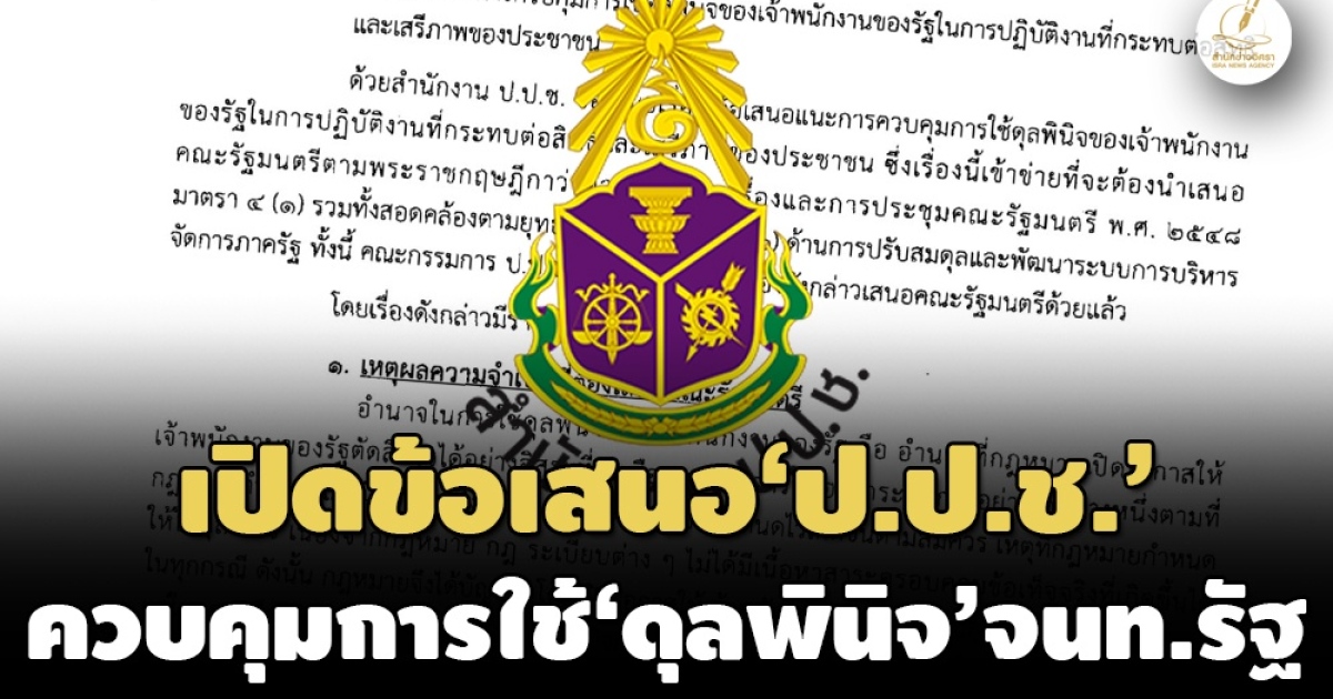 สำนักข่าวอิศรา (www.isranews.org) รายงานว่า ในการประชุมคณะรัฐมนตรี (ครม.) เมื่อวันที่ 25 ก.ค.ที่ผ่านมา ที่ประชุม ครม. รับทราบข้อเสนอแนะการควบคุมการใช้ดุลพินิจของเจ้าพนักงานของรัฐในการปฏิบัติงานที่กระทบต่อสิทธิและเสรีภาพของประชาชน ตามที่คณะกรรมการป้องกันและปราบปรามการทุจริตแห่งชาติ (ป.ป.ช) เสนอ เพื่อควบคุมการใช้ดุลพินิจของเจ้าพนักงานของรัฐในการปฏิบัติงานที่กระทบต่อสิทธิและเสรีภาพของประชาชน