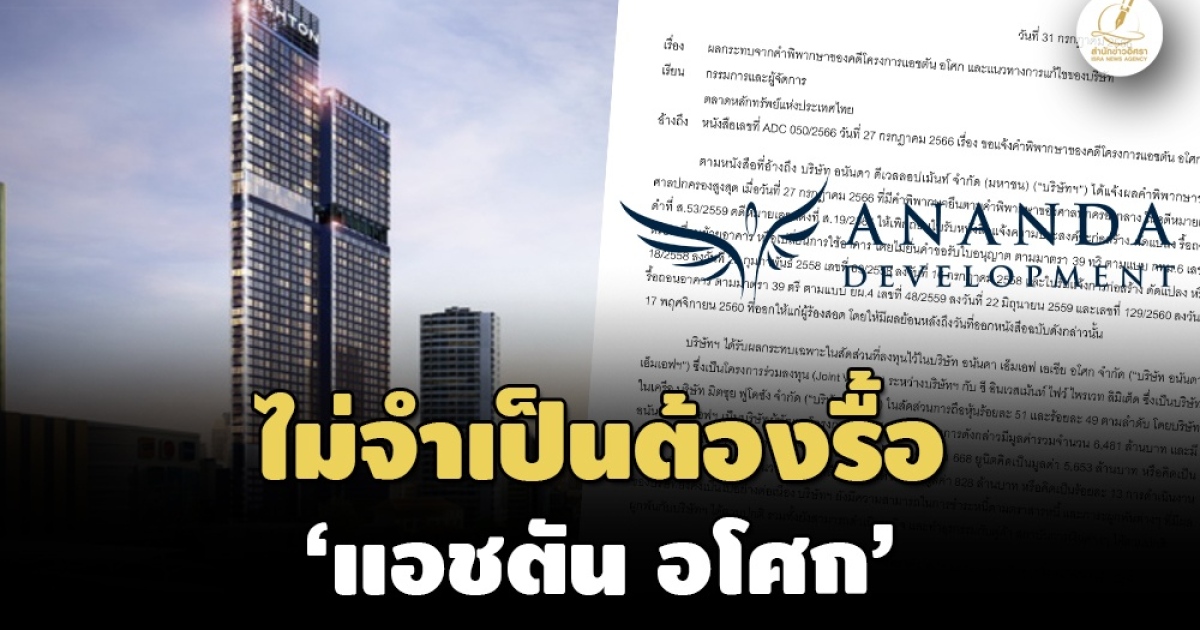 สำนักข่าวอิศรา (www.isranews.org) รายงานว่า เมื่อวันที่ 31 ก.ค. บมจ.อนันดา ดีเวลลอปเม้นท์ (ANAN) โดยนายชานนท์ เรืองกฤตยา ประธานเจ้าหน้าที่บริหาร ANAN1 แจ้งตลาดหลักทรัพย์ฯ เรื่อง ผลกระทบจากคำพิพากษาของคดีโครงการแอชตัน อโศก และแนวทางการแก้ไขของบริษัทฯ