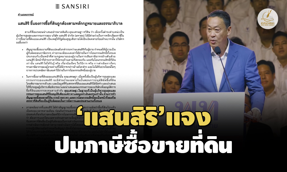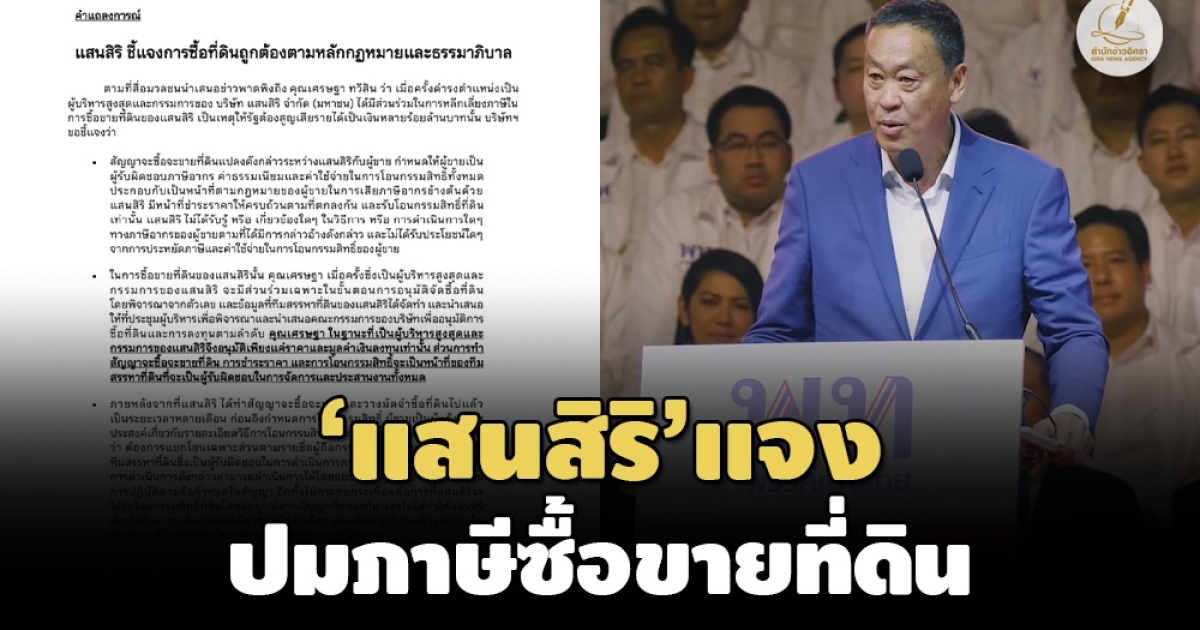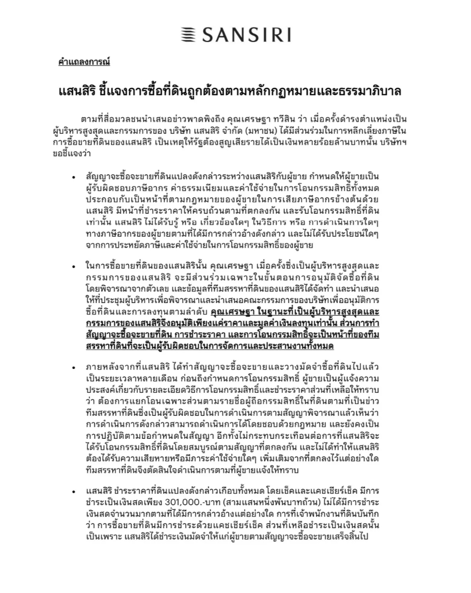 'แสนสิริ' ออกแถลงการณ์ชี้แจงกรณีพาดพิง 'เศรษฐา ทวีสิน' ปมหลีกเลี่ยงภาษีซื้อขายที่ดิน ทำให้รัฐสูญรายได้หลายร้อยล้าน ระบุ 'เศรษฐา' มีส่วนร่วมเฉพาะขั้นตอน 'อนุมัติจัดซื้อ' ส่วนการเสียภาษี 'ผู้ขาย' เป็นผู้รับผิดชอบ