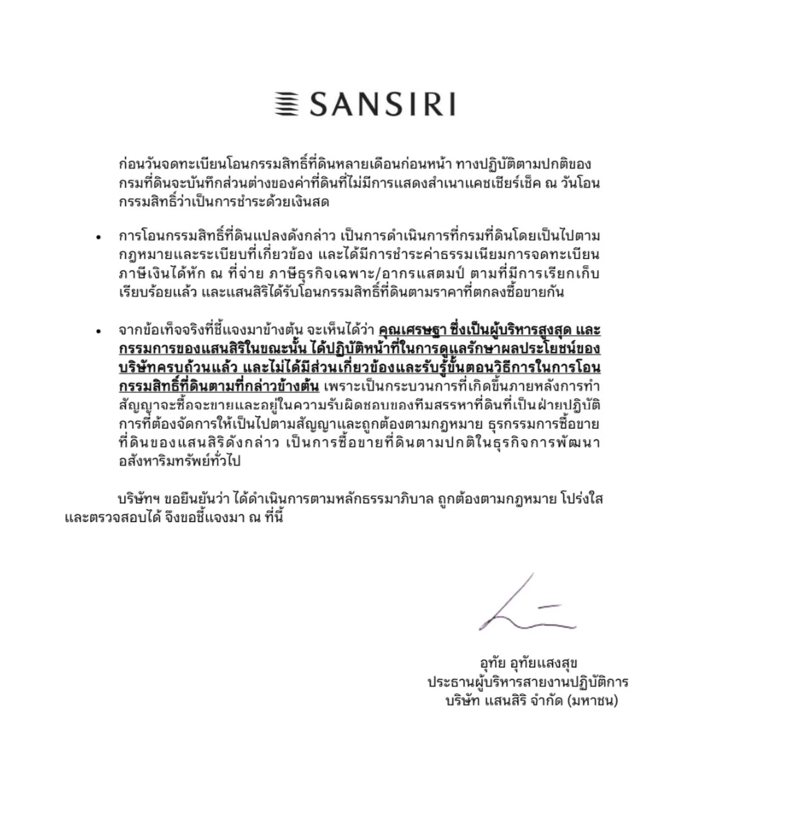 จากข้อเท็จจริงที่ชี้แจงมาข้างต้น จะเห็นได้ว่า คุณเศรษฐา ซึ่งเป็นผู้บริหารสูงสุด และกรรมการของแสนสิริในขณะนั้น ได้ปฏิบัติหน้ที่ในการดูแลรักษาผลประโยชน์ของบริษัทครบถ้วนแล้ว และไม่ได้มีส่วนเกี่ยวข้องและรับรู้ขั้นตอนวิธีการในการโอนกรรมสิทธิ์ที่ดินตามที่กล่าวข้างต้น