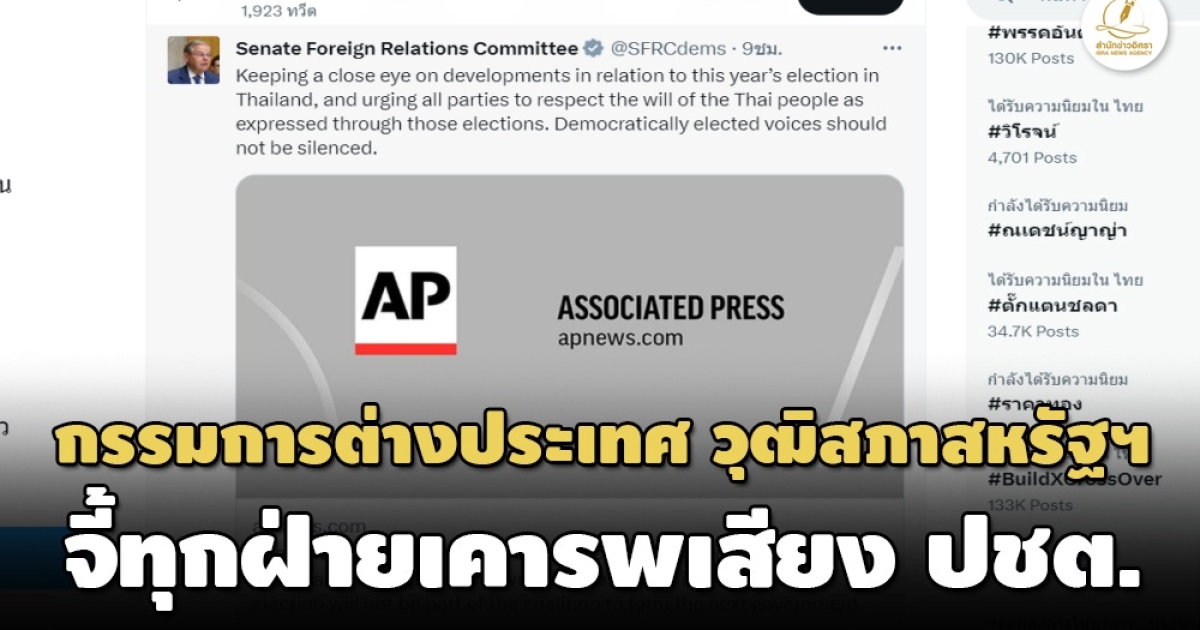 กรรมการกิจการต่างประเทศ วุฒิสภาสหรัฐฯ ทวีตจี้ทุกฝ่ายเคารพเจตนารมณ์ผู้มีสิทธิเลือกตั้ง หลังข่าวเพื่อไทยขับก้าวไกลร่วมจัดตั้งรัฐบาล ขณะ บ.ประเมินความเสี่ยงแคนาดาออกคำเตือนเลี่ยงเหตุการณ์ชุมนุมในไทย ส่วนฮิวแมนไรท์วอช ชี้ชัดการละเมิดสิทธิมีแนวโน้มจะเกิดขึ้นหลังจากนี้