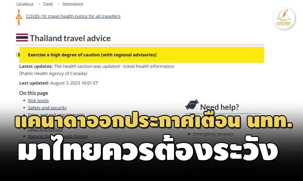 สำนักข่าวอิศรา (www.isranews.org) รายงานว่าเมื่อวันที่ 3 ส.ค. ที่ผ่านมา เว็บไซต์ของรัฐบาลแคนาดาได้เผยแพร่คำเตือนเกี่ยวกับการเดินทางท่องเที่ยวไปต่างประเทศ ซึ่งรวมถึงประเทศไทย ที่ทางรัฐบาลแคนาดาระบุว่าควรใช้ระมัดระวังในระดับสูงในสำหรับการเดินทางมายังประเทศไทย