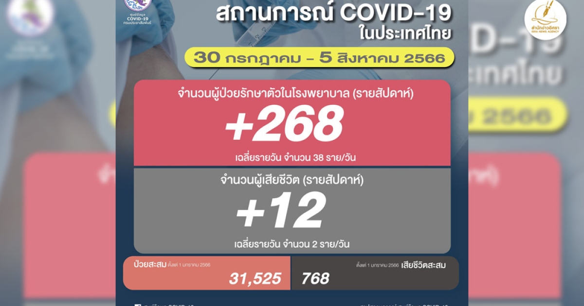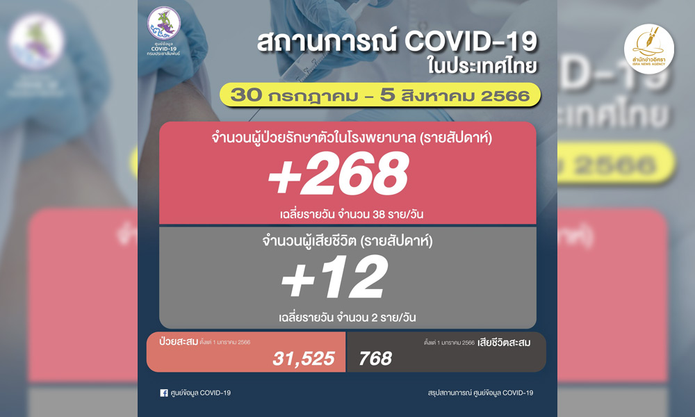 สำนักข่าวอิศรา (www.isranews.org) รายงานสถานการณ์แพร่ระบาดของโรคโควิด-19 ประเทศไทย ประจำสัปดาห์ ระหว่างวันที่ 30 ก.ค. - 5 ส.ค. 2566 มีจำนวนผู้ติดเชื้อใหม่เข้ารักษาตัวโรงพยาบาล 268 ราย เฉลี่ยวันละ 38 ราย ทำให้จำนวนผู้ติดเชื้อสะสมอยู่ที่ 31,525 ราย (ตั้งแต่ 1 ม.ค. 2566)