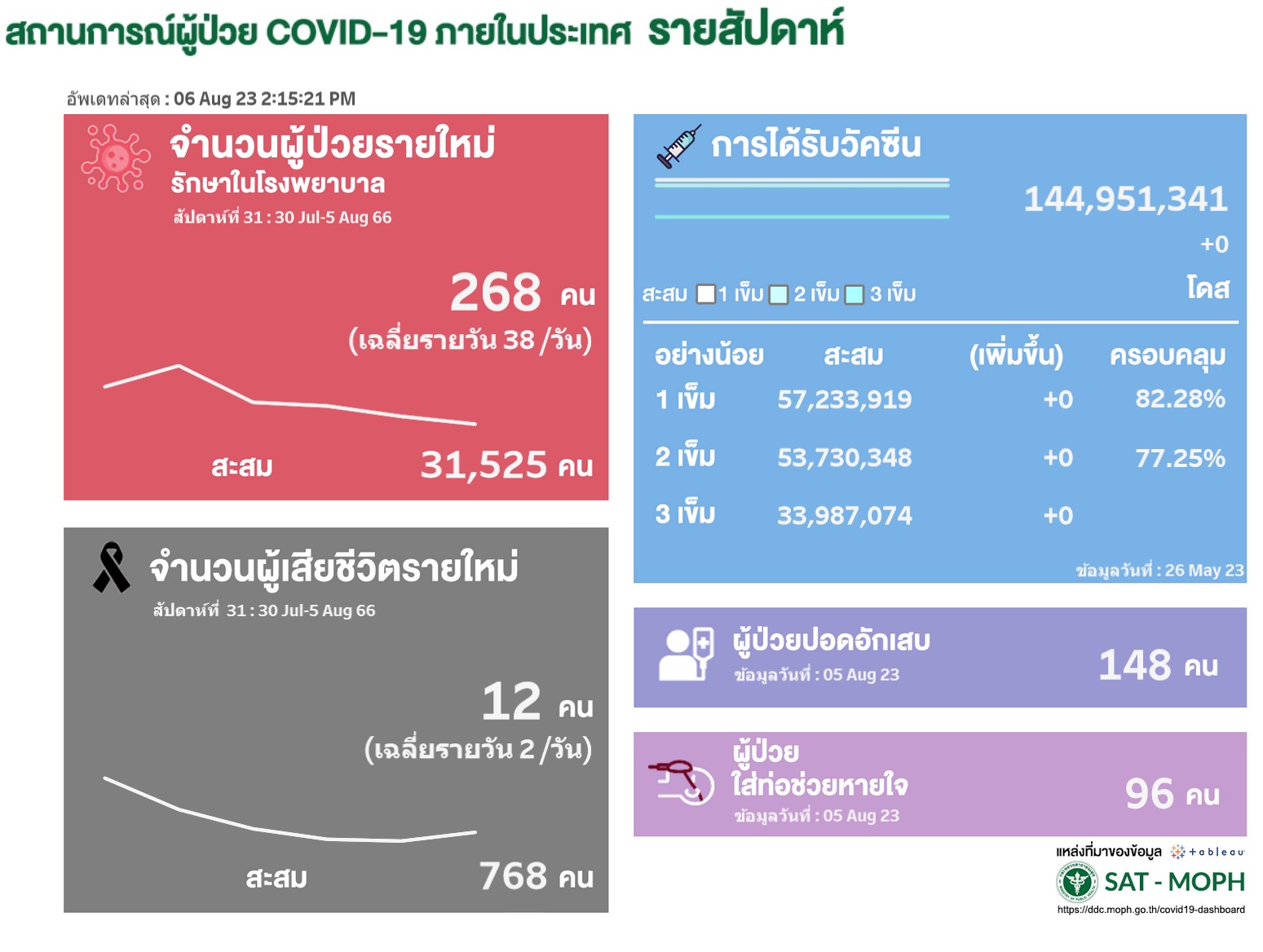 สถานการณ์โควิดไทย สัปดาห์ล่าสุด 30 ก.ค. - 5 ส.ค. 2566 ติดเชื้อเข้ารักษาใน รพ.ใหม่ 268 ราย เฉลี่ย 38/วัน เสียชีวิต 2 ราย อาการหนัก 148 ราย