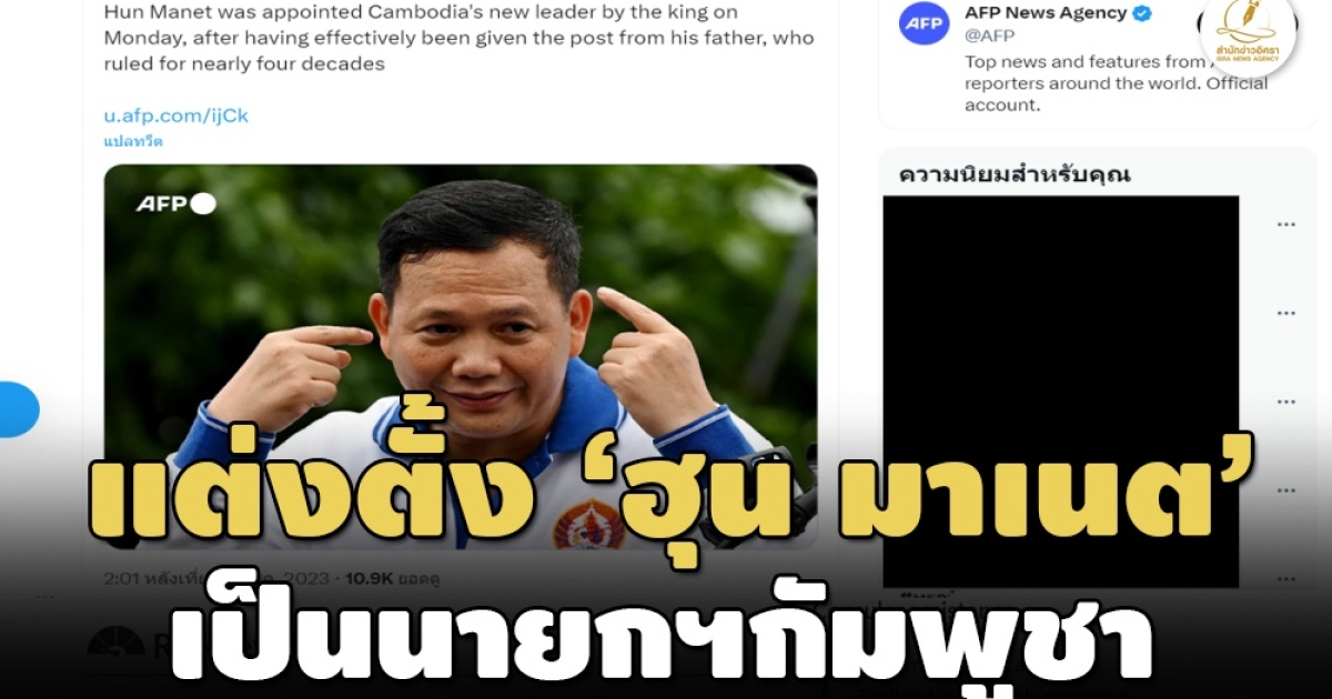 กษัตริย์กัมพูชาแต่งตั้ง 'ฮุน มาเนต' ลูกชาย 'ฮุน เซน' เป็นนายกฯกัมพูชา ขณะเจ้าตัวระบุเป็นโอกาสยิ่งใหญ่ที่จะรับใช้ชาติ ขณะผู้เชี่ยวชาญคาดกัมพูชาจะไม่เปลี่ยนแปลง,ปฏิรูป หรือเข้าหาตะวันตกมากขึ้น