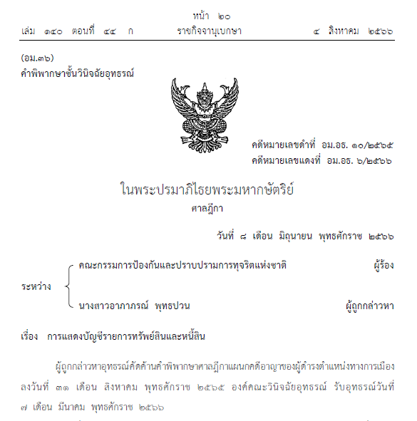 สำนักข่าวอิศรา (www.isranews.org) วันที่ 4 ส.ค.2566 ราชกิจจานุเบกษา เผยแพร่ คำพิพากษาของศาลฎีกา เรื่อง การแสดงบัญชีรายการทรัพย์สินและหนี้สิน [คดีหมายเลขดำที่ อม.อธ. 10/2565 คดีหมายเลขแดงที่ อม.อธ. 6/2566 ระหว่าง คณะกรรมการป้องกันและปราบปรามการทุจริตแห่งชาติ ผู้ร้อง นางสาวอาภาภรณ์ พุทธปวน ผู้ถูกกล่าวหา] สรุปว่า วันที่ 8 มิถุนายน 2566 องค์คณะวินิจฉัยอุทธรณ์ที่ประชุมใหญ่ศาลฎีกา พิพากษา ยืนตามศาลฎีกาแผนกคดีอาญาของผู้ดำรงตำแหน่งทางการเมือง นางสาวอาภาภรณ์ พุทธปวน รองนายกเทศมนตรีตําบลต้นธง อําเภอเมืองลําพูน จังหวัดลําพูน จงใจยื่นบัญชีแสดงรายการทรัพย์สินและหนี้สินและเอกสารประกอบต่อคณะกรรมการป้องกันและปราบปรามการทุจริตแห่งชาติ (คณะกรรมการ ป.ป.ช.) ผู้ร้อง ด้วยข้อความอันเป็นเท็จหรือปกปิดข้อเท็จจริงที่ควรแจ้งให้ทราบ และมีพฤติการณ์อันควรเชื่อได้ว่า มีเจตนาไม่แสดงที่มาแห่งทรัพย์สินหรือหนี้สินนั้น