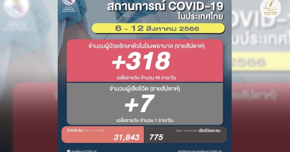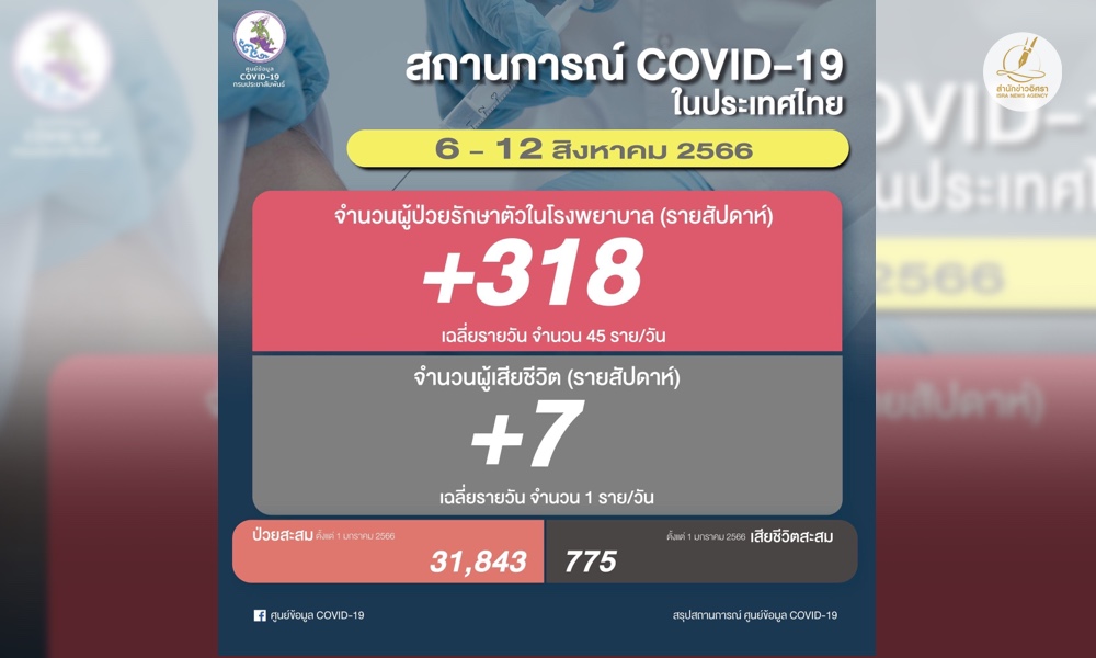 สำนักข่าวอิศรา (www.isranews.org) รายงานสถานการณ์แพร่ระบาดของโรคโควิด-19 ประเทศไทย ประจำสัปดาห์ ระหว่างวันที่ 6 ส.ค. - 12 ส.ค. 2566 มีจำนวนผู้ติดเชื้อใหม่เข้ารักษาตัวโรงพยาบาล 318 ราย เฉลี่ยวันละ 45 ราย ทำให้จำนวนผู้ติดเชื้อสะสมอยู่ที่ 31,843 ราย (ตั้งแต่ 1 ม.ค. 2566)