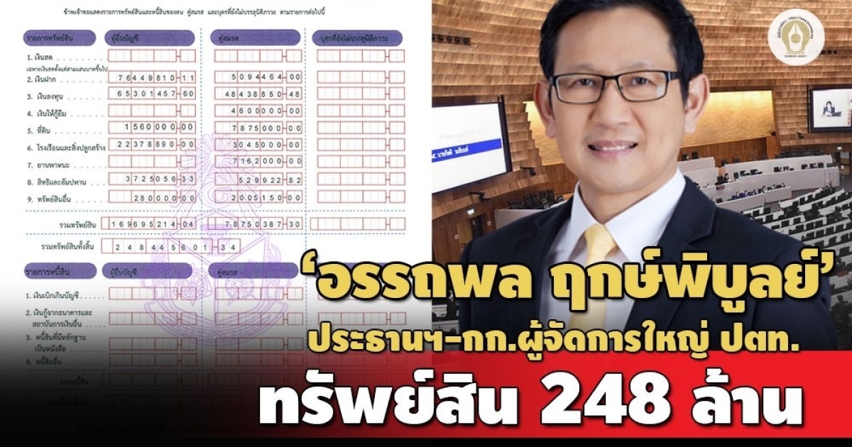โดย นายอรรถพล พร้อมด้วย นางวรทิพย์ ฤกษ์พิบูลย์ คู่สมรส แจ้งมีทรัพย์สินทั้งสิ้น 248,445,601 บาท ไร้หนี้สิน