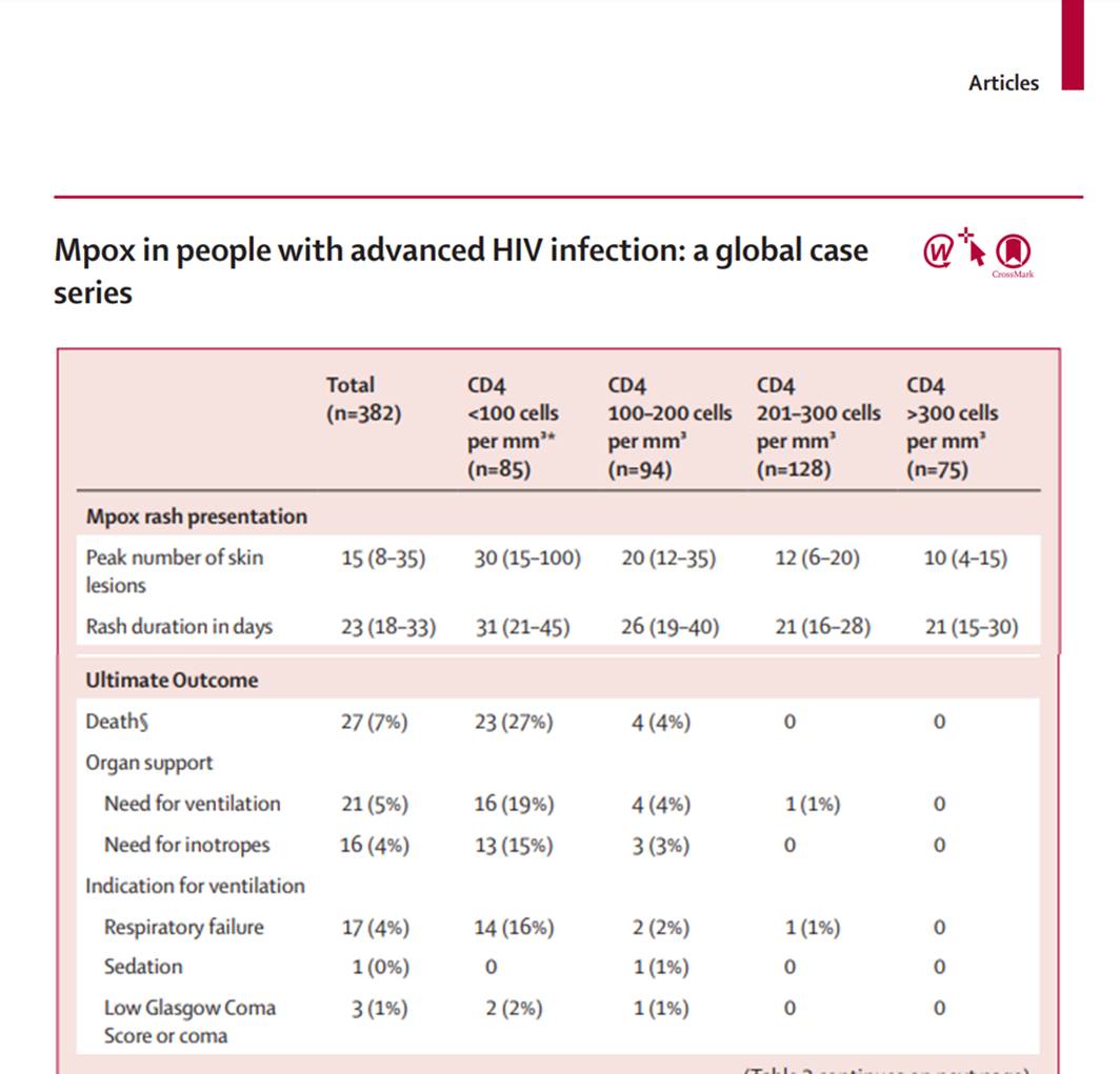 ดร.อนันต์ ระบุว่า ข้อมูลนี้เอาตัวเลขมาจากงานวิจัยที่ตีพิมพ์ใน Lancet มาตั้งแต่เดือนมีนาคมปีนี้ แสดงความรุนแรงของฝีดาษลิงในผู้ป่วยติดเชื้อ HIV-1 ที่มีภาวะภูมิคุ้มกันบกพร่องโดยใช้ระดับของเม็ดเลือดขาว CD4 เป็นเกณฑ์ในการแบ่งผู้ป่วยออกเป็นกลุ่มต่างๆ ข้อมูลในการศึกษานี้มีเยอะมาก แต่ประเด็นเรื่องความรุนแรงที่คนสนใจคือ อัตราการเสียชีวิต ซึ่งถ้าดูผู้ป่วยที่เสียชีวิตทั้งหมดในการศึกษาชิ้นนี้ 27 คน มีจำนวนถึง 23 ราย อยู่ในกลุ่มที่มี CD4 ต่ำมาก และ มี 4 ราย มี CD4 ในระดับต่ำกว่าเกณฑ์สูงเช่นกัน ในขณะที่ผู้ป่วยที่มี CD4 ตั้งแต่ 200 เซลล์ต่อ mm3 ยังไม่พบผู้ป่วยเสียชีวิต