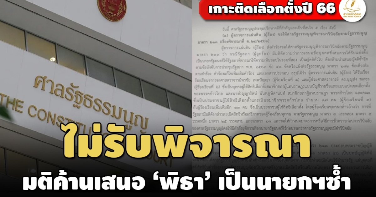 ศาลรัฐธรรมนูญมีมติเป็นเอกฉันทน์ไม่รับพิจารณาคำร้องผู้ตรวจการแผ่นดิน ปมเสนอชื่อ 'พิธา' เป็นนายกฯซ้ำ เหตุผู้ร้องไม่ใช่แคนดิเดตนายกรัฐมนตรีที่ถูกเสนอชื่อโดยพรรคการเมือง ส่งผลคำร้องอื่นตกไปด้วย